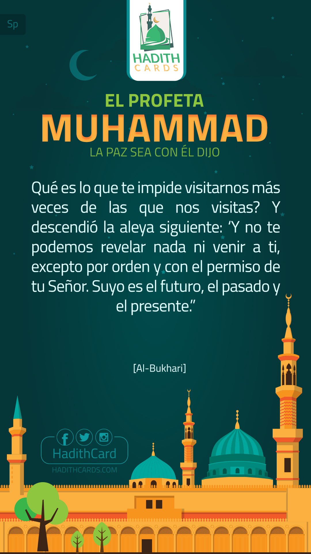 Qué es lo que te impide visitarnos más veces de las que nos visitas? Y descendió la aleya siguiente: ‘Y no te podemos revelar nada ni venir a ti, excepto por orden y con el permiso de tu Señor. Suyo es el futuro, el pasado y el presente