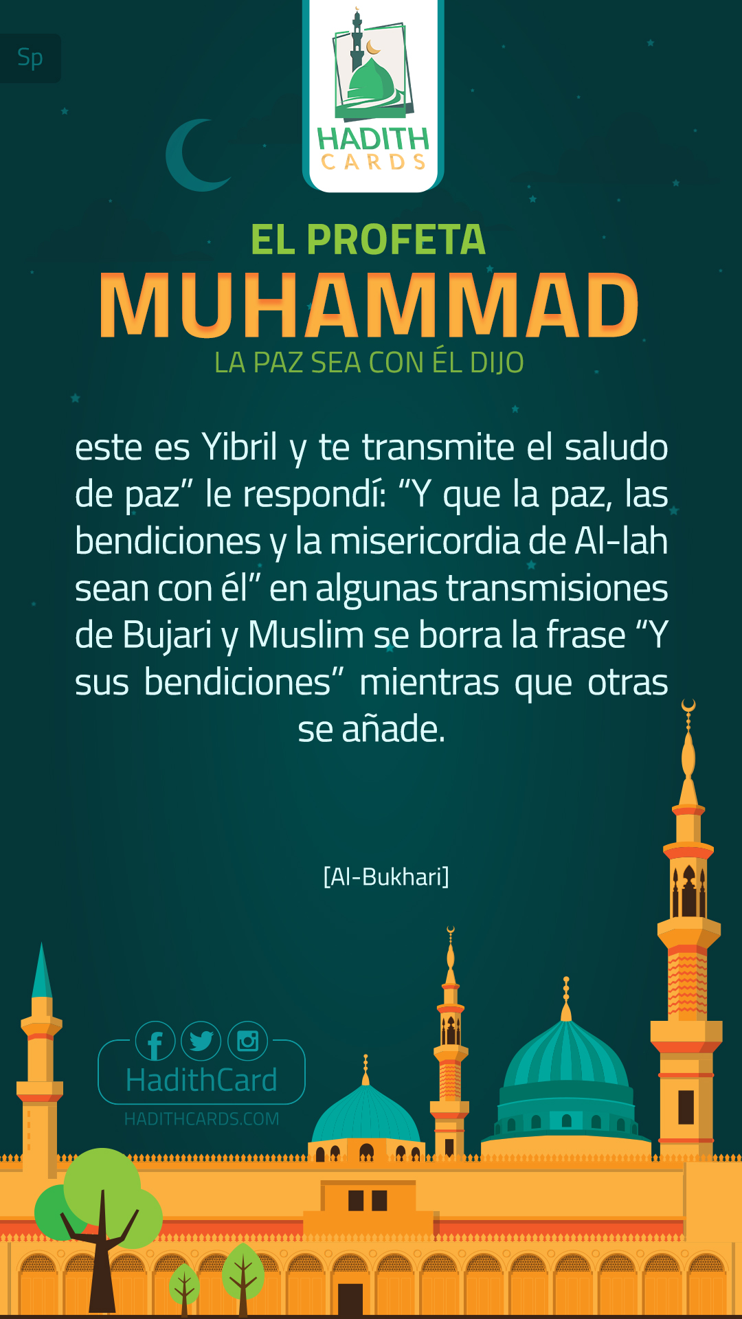 este es Yibril y te transmite el saludo de paz” le respondí: “Y que la paz, las bendiciones y la misericordia de Al-lah sean con él” en algunas transmisiones de Bujari y Muslim se borra la frase “Y sus bendiciones” mientras que otras se añade