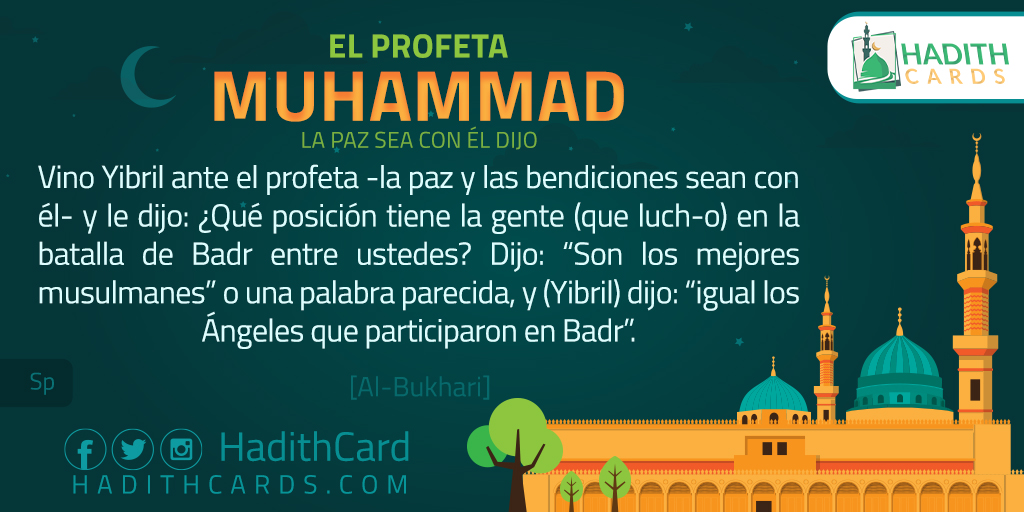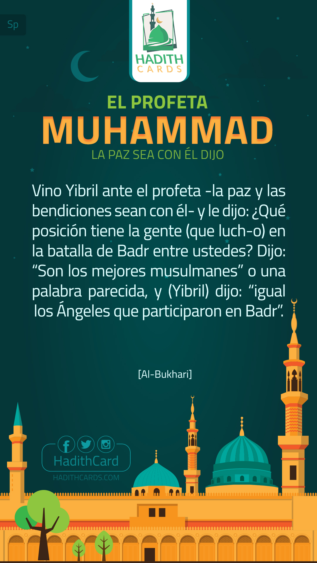 Vino Yibril ante el profeta -la paz y las bendiciones sean con él- y le dijo: ¿Qué posición tiene la gente (que luch-o) en la batalla de Badr entre ustedes? Dijo: “Son los mejores musulmanes” o una palabra parecida, y (Yibril) dijo: “igual los Ángeles que participaron en Badr