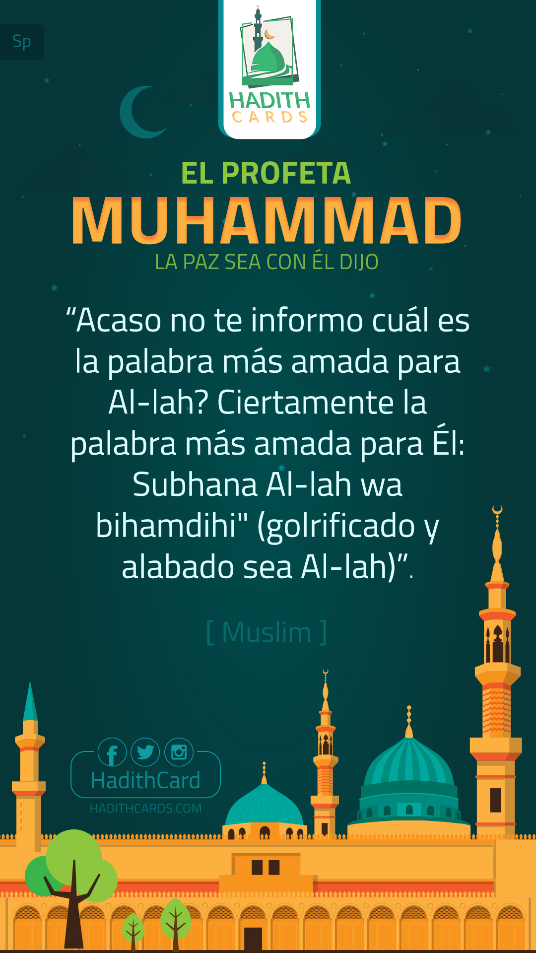 ¿Acaso no te informo cuál es la palabra más amada para Al-lah? Ciertamente la palabra más amada para Él: Subhana Al-lah wa bihamdihi" (golrificado y alabado sea Al-lah