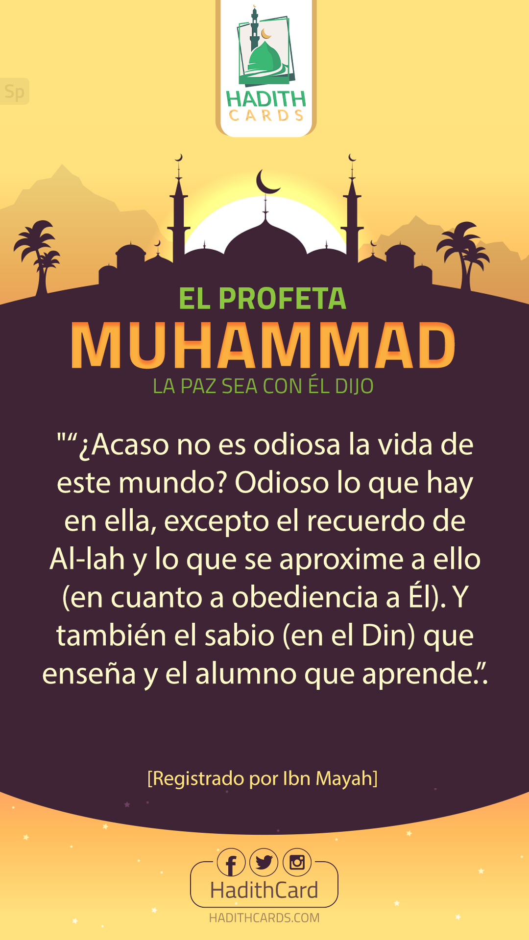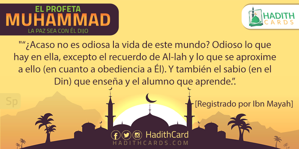 ¿Acaso no es odiosa la vida de este mundo? Odioso lo que hay en ella, excepto el recuerdo de Al-lah y lo que se aproxime a ello (en cuanto a obediencia a Él). Y también el sabio (en el Din) que enseña y el alumno que aprende