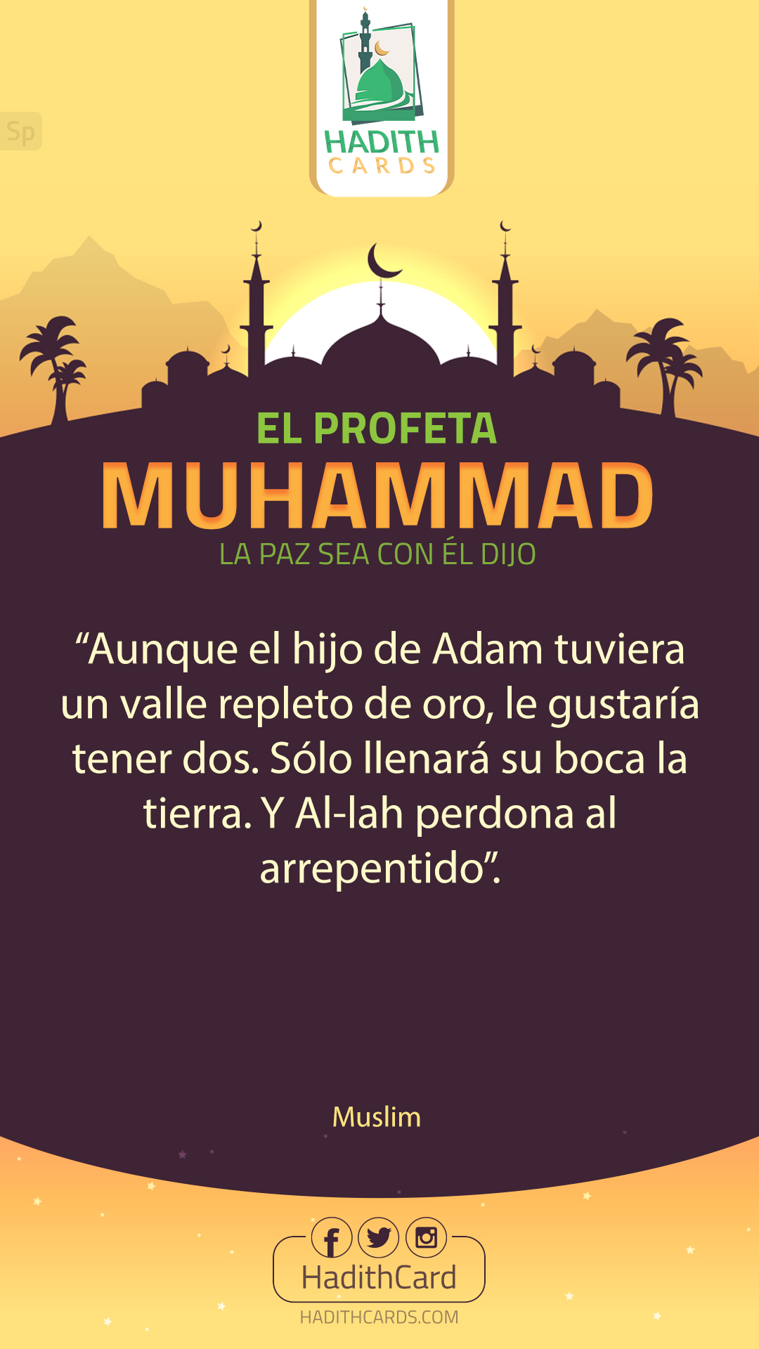 Aunque el hijo de Adam tuviera un valle repleto de oro, le gustaría tener dos. Sólo llenará su boca la tierra. Y Al-lah perdona al arrepentido