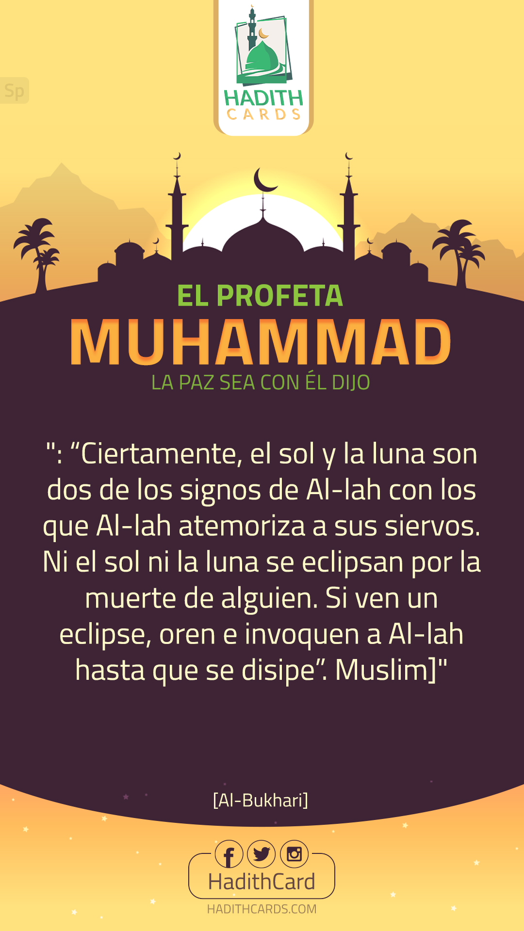 Ciertamente, el sol y la luna son dos de los signos de Al-lah con los que Al-lah atemoriza a sus siervos. Ni el sol ni la luna se eclipsan por la muerte de alguien. Si ven un eclipse, oren e invoquen a Al-lah hasta que se disipe