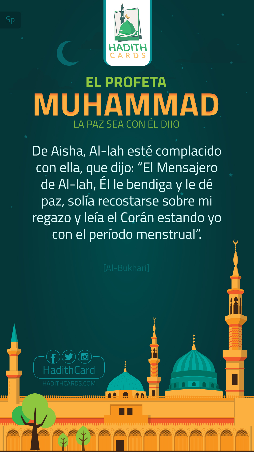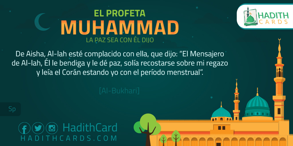De Aisha, Al-lah esté complacido con ella, que dijo: “El Mensajero de Al-lah, Él le bendiga y le dé paz, solía recostarse sobre mi regazo y leía el Corán estando yo con el período menstrual
