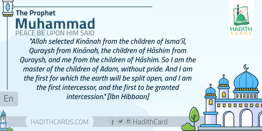 Allah selected Kinānah from the children of Isma‘īl, Quraysh from Kinānah, the children of Hāshim from Quraysh, and me from the children of Hāshim. So I am the master of the children of Adam, without pride. And I am the first for which the earth will be split open, and I am the first intercessor, and the first to be granted intercession. [Ibn Hibbaan]