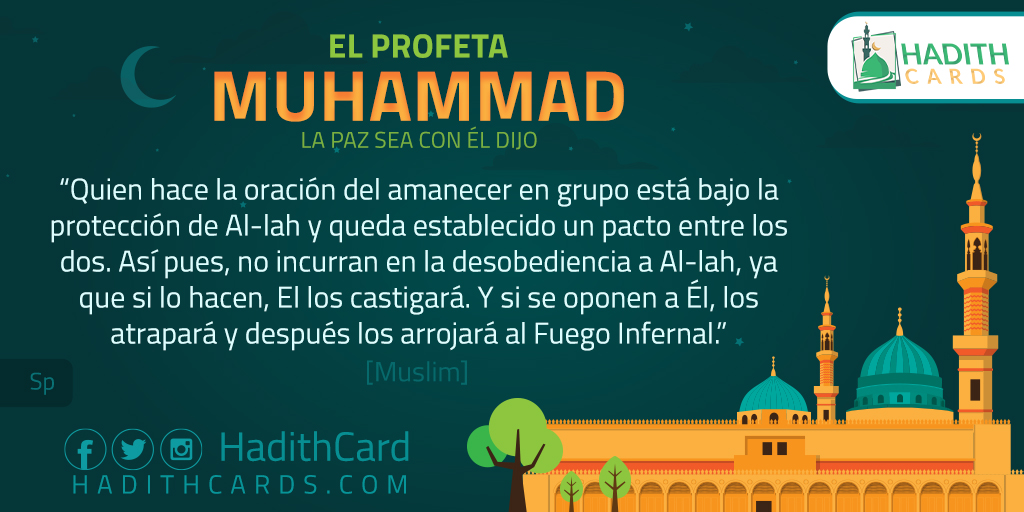 Quien hace la oración del amanecer en grupo está bajo la protección de Al-lah y queda establecido un pacto entre los dos. Así pues, no incurran en la desobediencia a Al-lah, ya que si lo hacen, El los castigará. Y si se oponen a Él, los atrapará y después los arrojará al Fuego Infernal