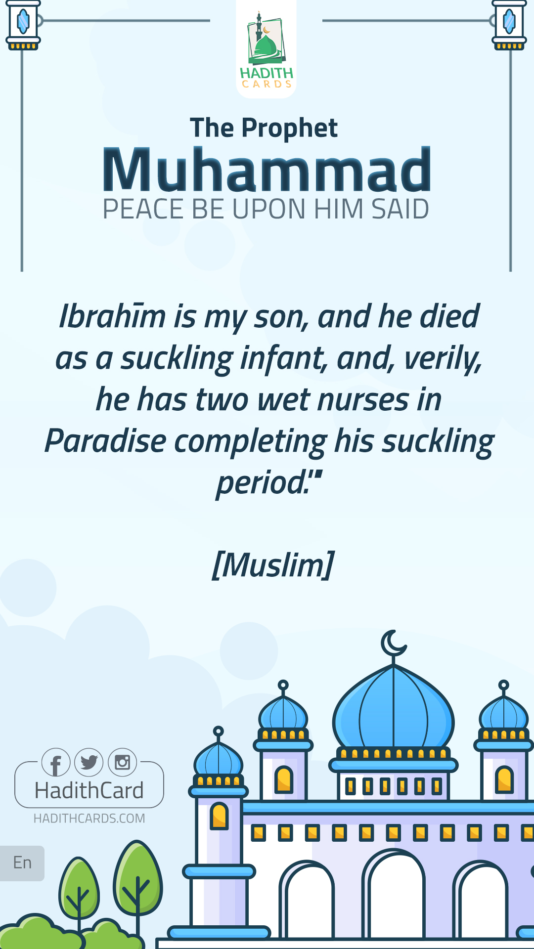 «إن إبراهيم ابني، وإنه مات في الثَّدي، وإن له لظِئْرين تُكمِلان رضاعه في الجنة». [مسلم]