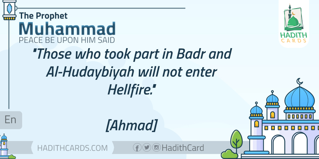 «لن يدخلَ النارَ رجلٌ شَهِد بدرًا والحُدَيْبِيَة». [أحمد]