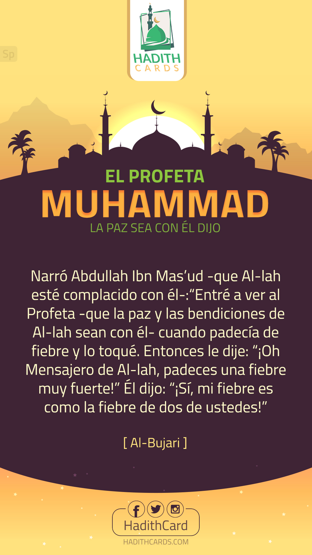Entré a ver al Profeta -que la paz y las bendiciones de Al-lah sean con él- cuando padecía de fiebre y lo toqué. Entonces le dije: “¡Oh Mensajero de Al-lah, padeces una fiebre muy fuerte!” Él dijo: “¡Sí, mi fiebre es como la fiebre de dos de ustedes!