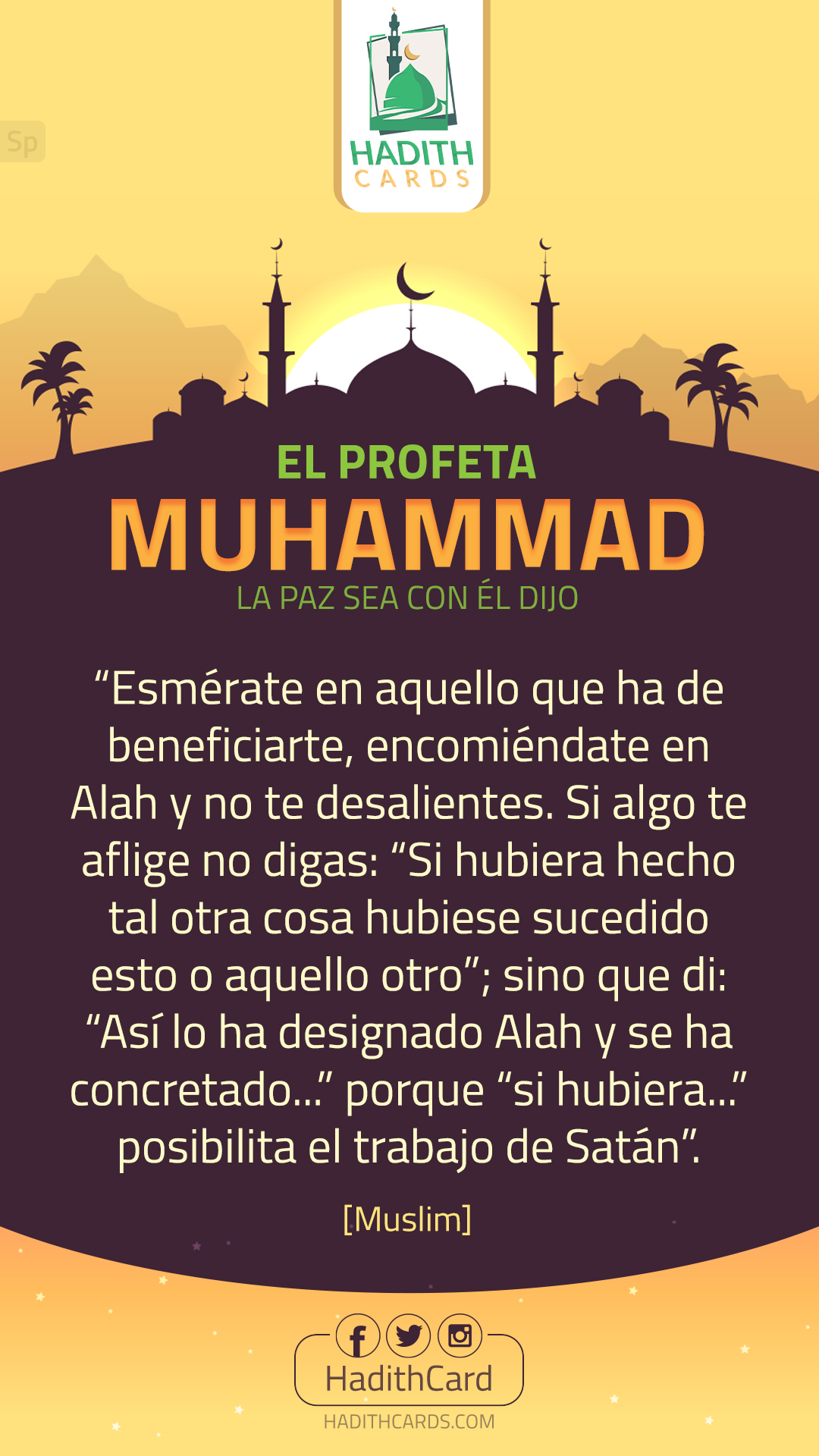 Esmérate en aquello que ha de beneficiarte, encomiéndate en Alah y no te desalientes. Si algo te aflige no digas: “Si hubiera hecho tal otra cosa hubiese sucedido esto o aquello otro”; sino que di: “Así lo ha designado Alah y se ha concretado...” porque “si hubiera...” posibilita el trabajo de Satán