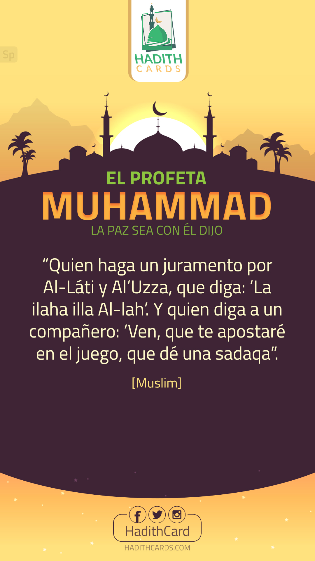 Quien haga un juramento por Al-Láti y Al‘Uzza, que diga: ‘La ilaha illa Al-lah’. Y quien diga a un compañero: ‘Ven, que te apostaré en el juego, que dé una sadaqa