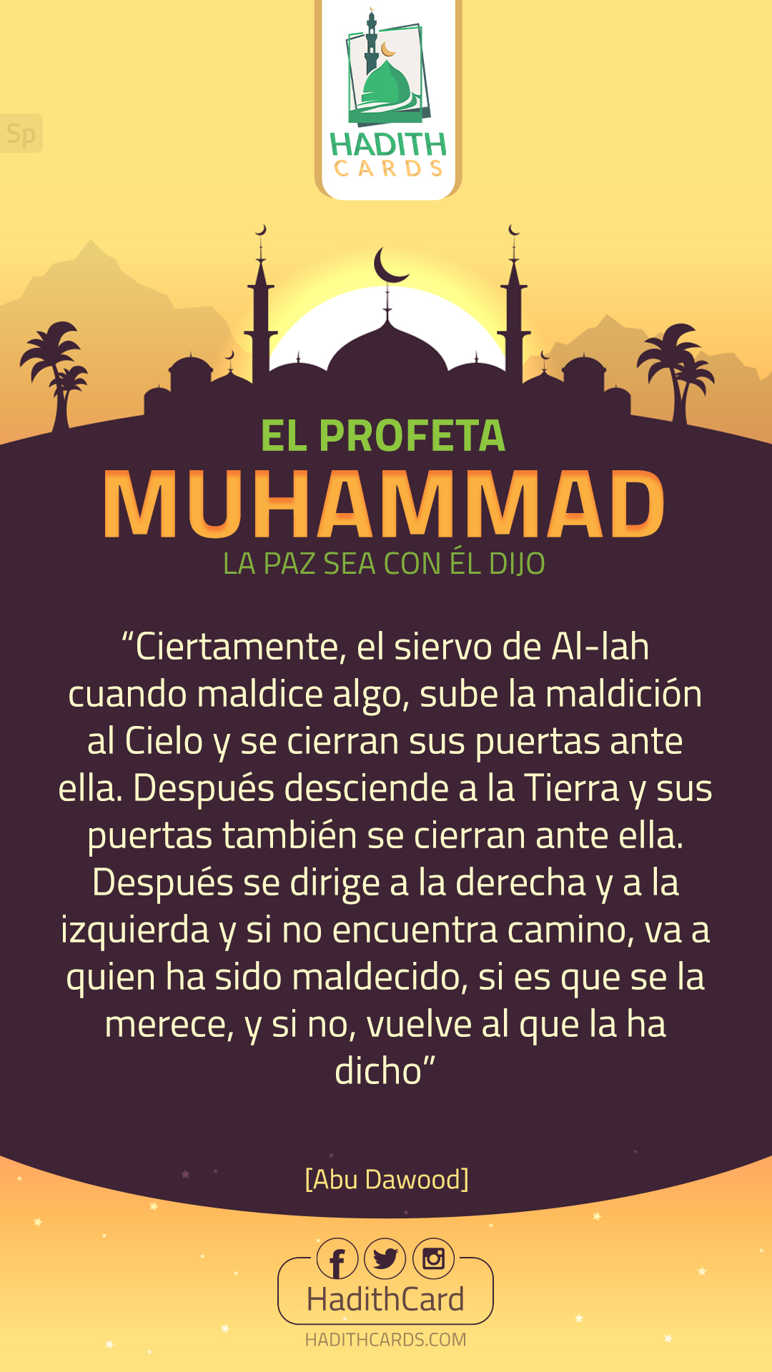 Ciertamente, el siervo de Al-lah cuando maldice algo, sube la maldición al Cielo y se cierran sus puertas ante ella. Después desciende a la Tierra y sus puertas también se cierran ante ella. Después se dirige a la derecha y a la izquierda y si no encuentra camino, va a quien ha sido maldecido, si es que se la merece, y si no, vuelve al que la ha dicho
