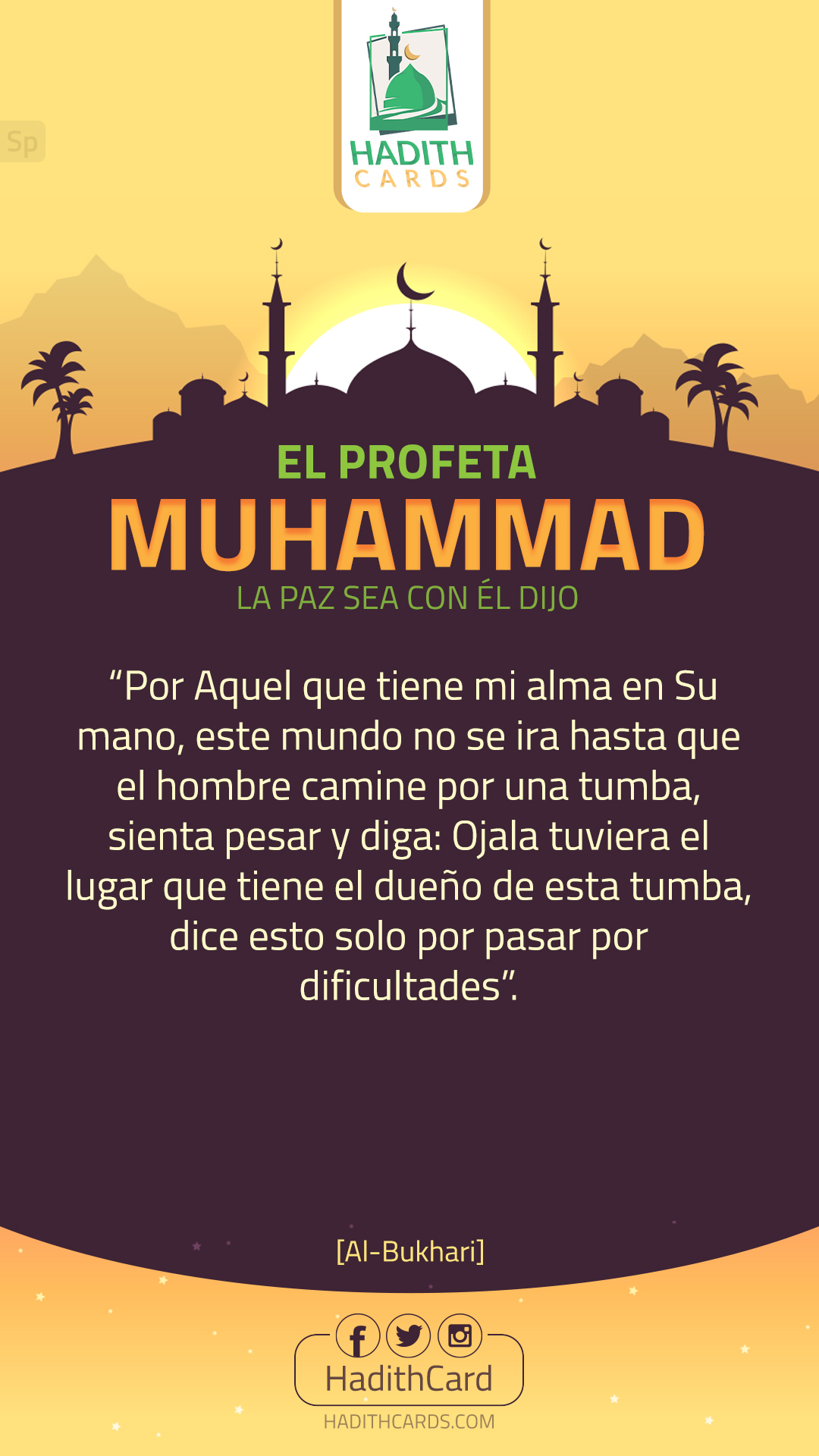 Por Aquel que tiene mi alma en Su mano, este mundo no se ira hasta que el hombre camine por una tumba, sienta pesar y diga: Ojala tuviera el lugar que tiene el dueño de esta tumba, dice esto solo por pasar por dificultades