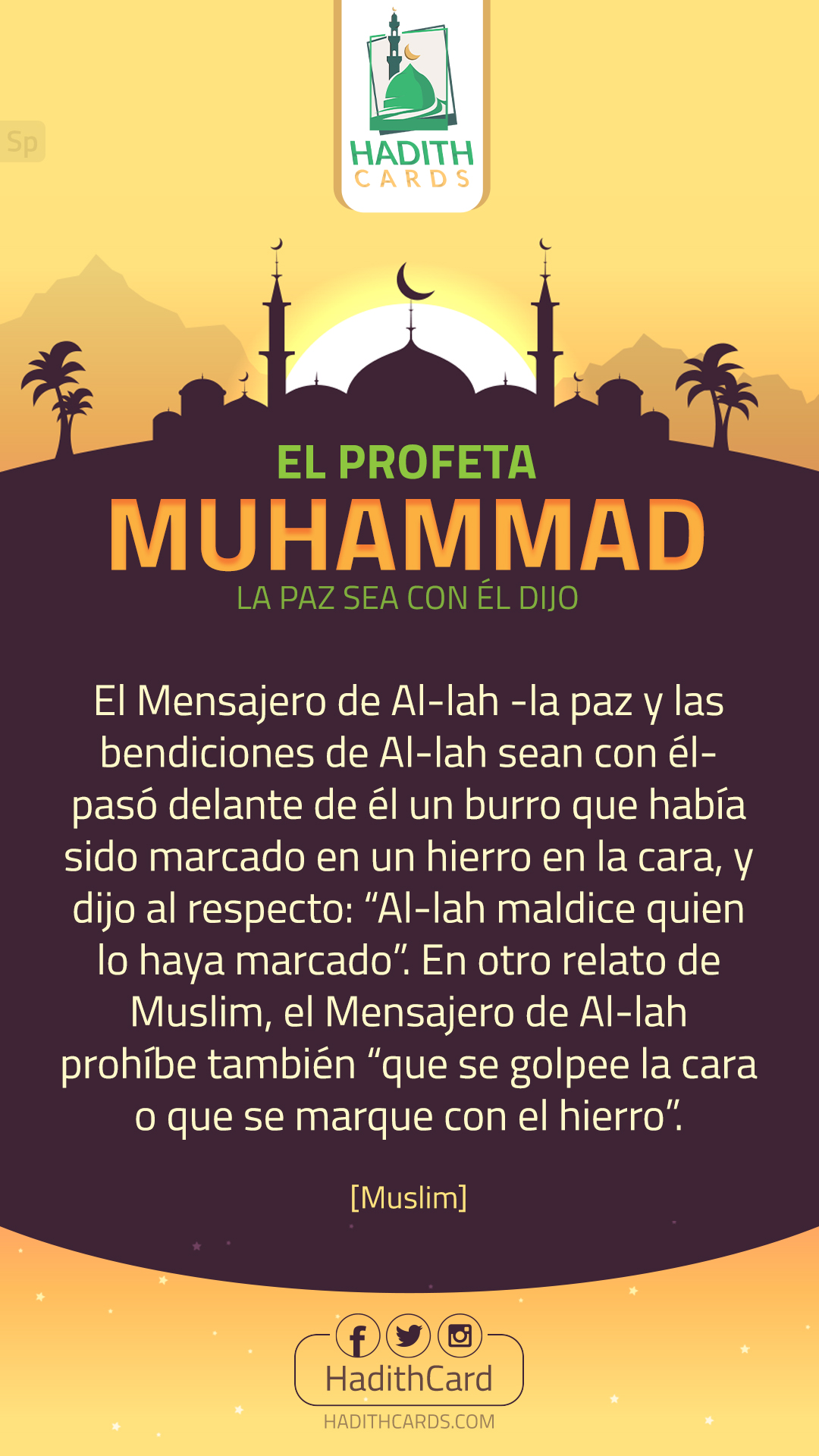 Al-lah maldice quien lo haya marcado”. En otro relato de Muslim, el Mensajero de Al-lah prohíbe también “que se golpee la cara o que se marque con el hierro