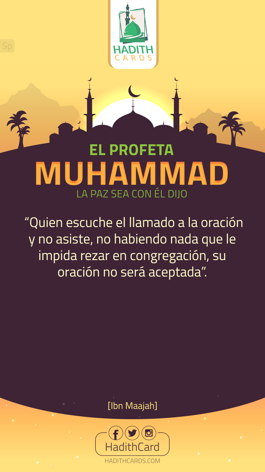 Quien escuche el llamado a la oración y no asiste, no habiendo nada que le impida rezar en congregación, su oración no será aceptada