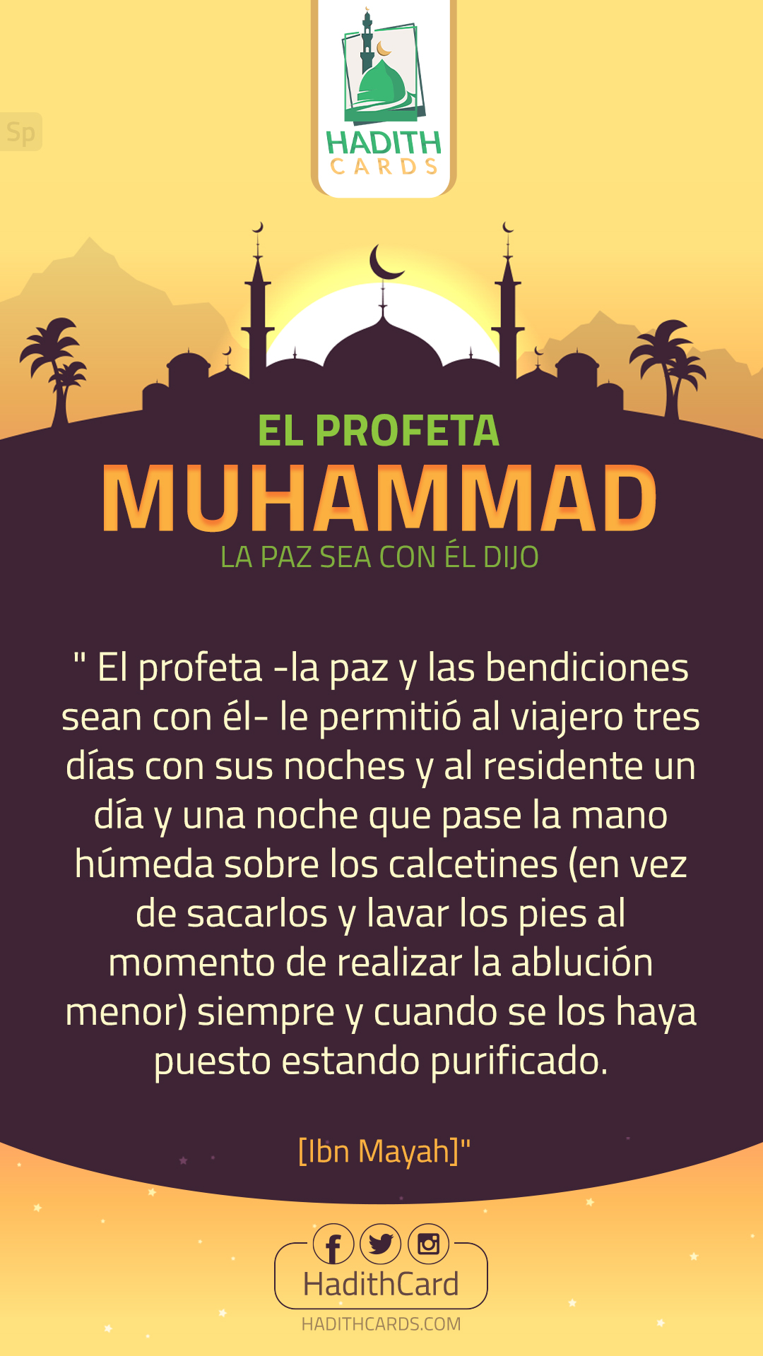 El profeta -la paz y las bendiciones sean con él- le permitió al viajero tres días con sus noches y al residente un día y una noche que pase la mano húmeda sobre los calcetines (en vez de sacarlos y lavar los pies al momento de realizar la ablución menor) siempre y cuando se los haya puesto estando purificado