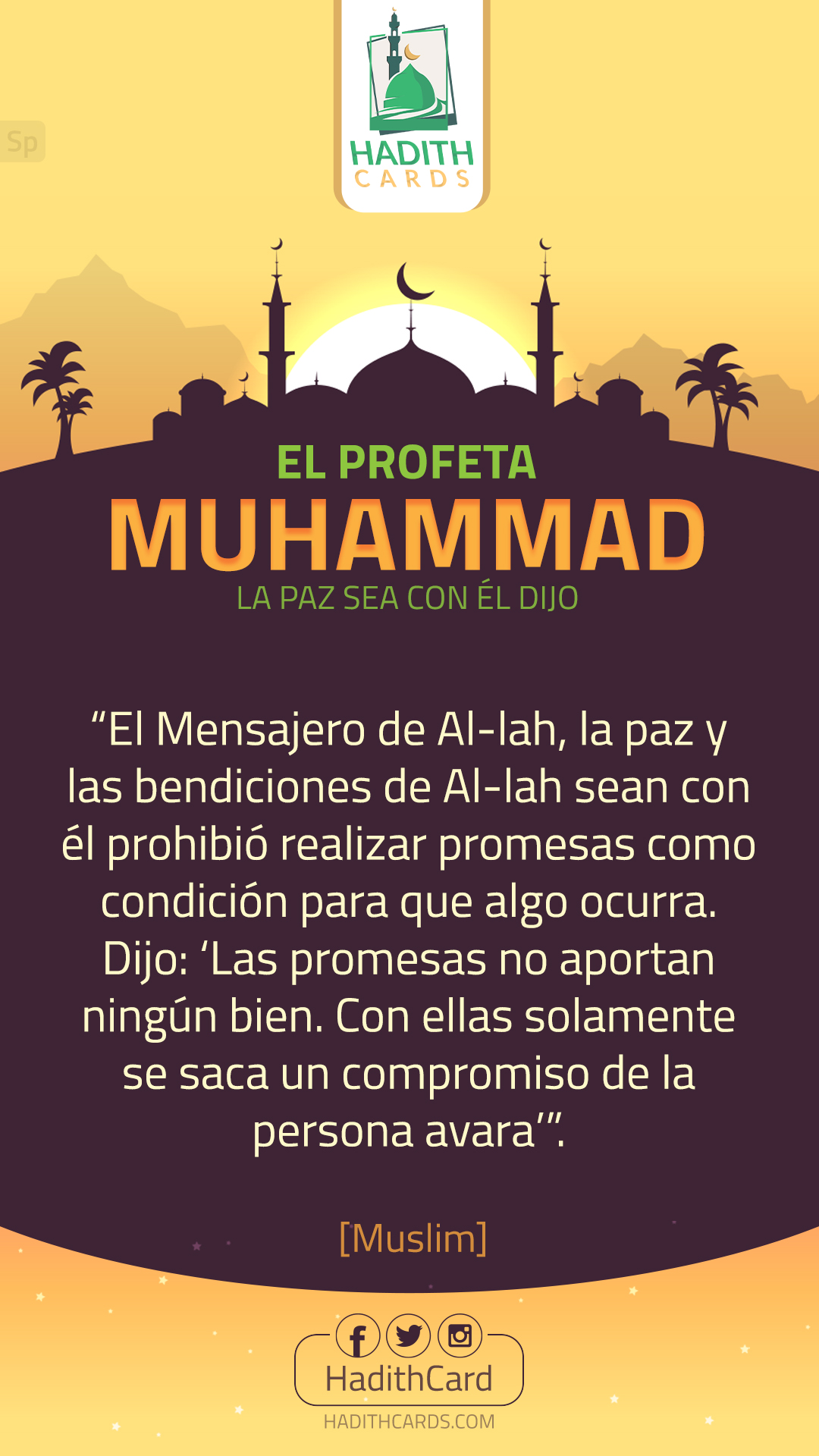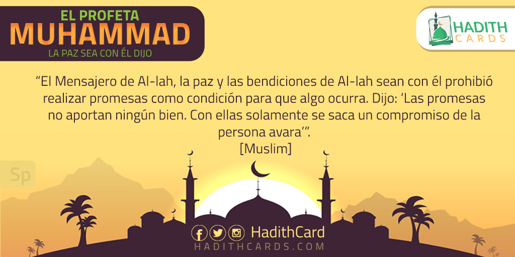 El Mensajero de Al-lah, la paz y las bendiciones de Al-lah sean con él prohibió realizar promesas como condición para que algo ocurra. Dijo: ‘Las promesas no aportan ningún bien. Con ellas solamente se saca un compromiso de la persona avara