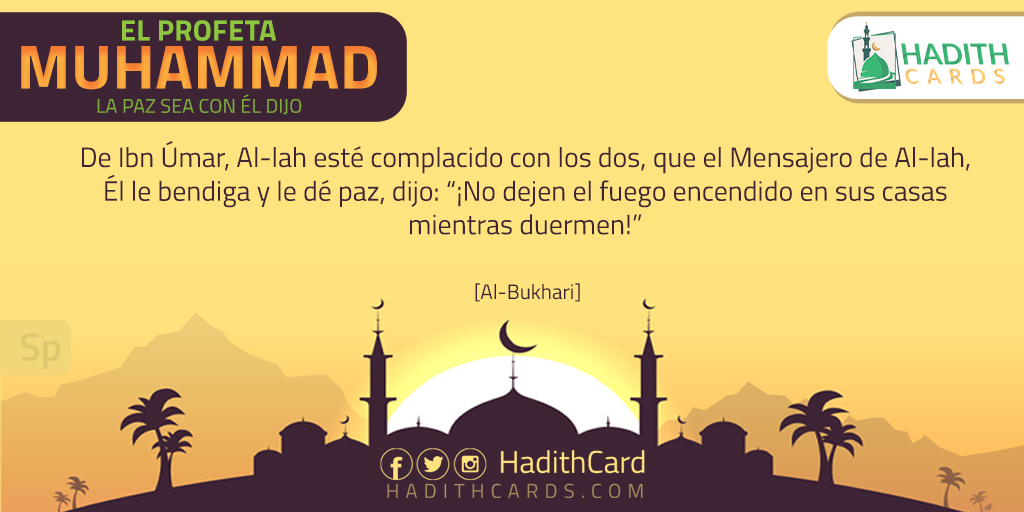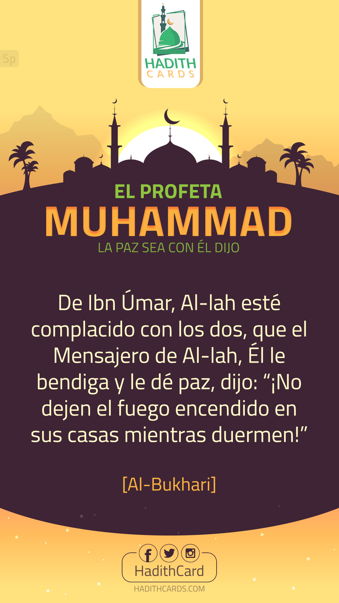 De Ibn Úmar, Al-lah esté complacido con los dos, que el Mensajero de Al-lah, Él le bendiga y le dé paz, dijo: “¡No dejen el fuego encendido en sus casas mientras duermen!