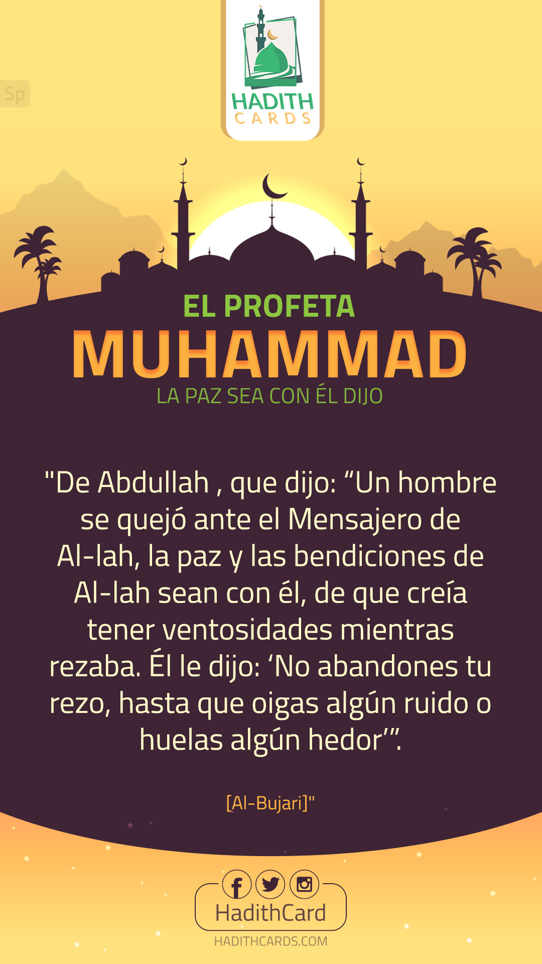 De Abdullah , que dijo: “Un hombre se quejó ante el Mensajero de Al-lah, la paz y las bendiciones de Al-lah sean con él, de que creía tener ventosidades mientras rezaba. Él le dijo: ‘No abandones tu rezo, hasta que oigas algún ruido o huelas algún hedor
