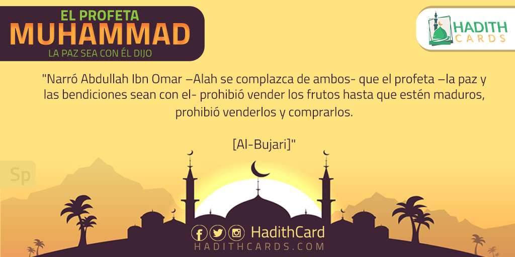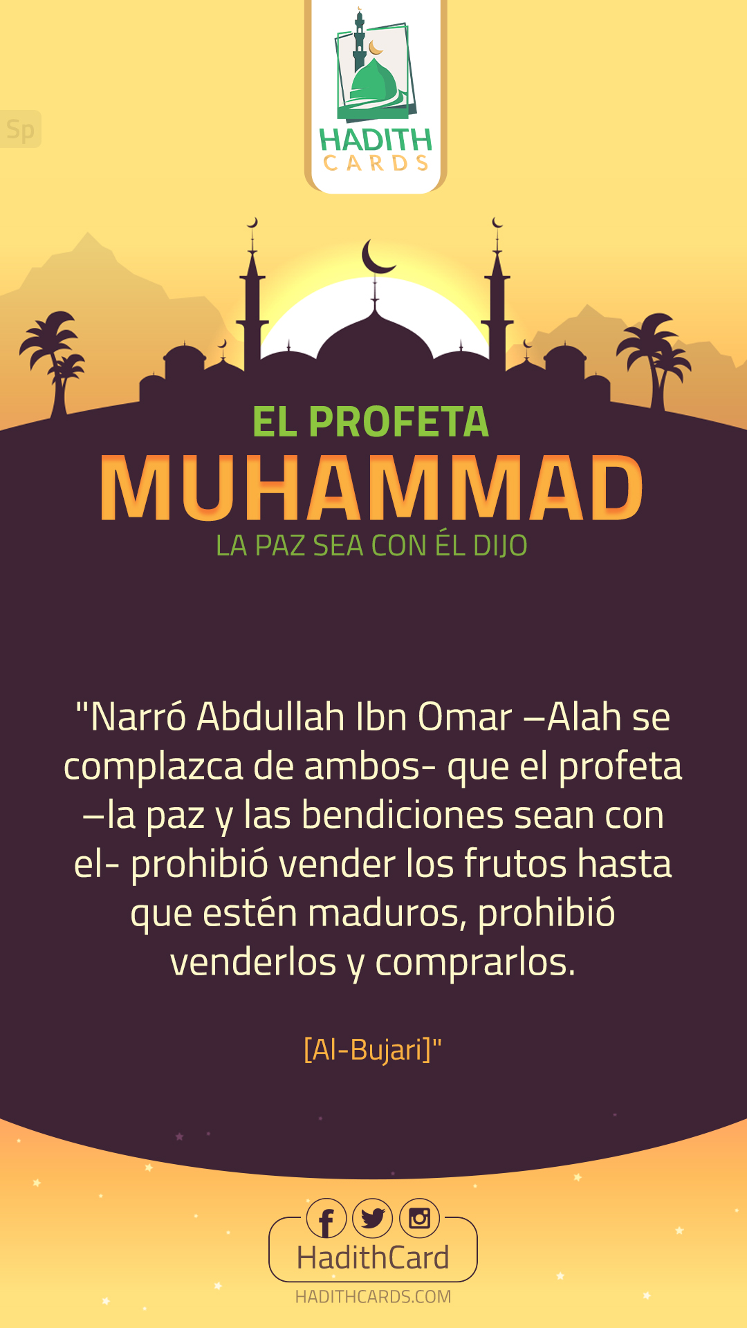 Narró Abdullah Ibn Omar –Alah se complazca de ambos- que el profeta –la paz y las bendiciones sean con el- prohibió vender los frutos hasta que estén maduros, prohibió venderlos y comprarlos