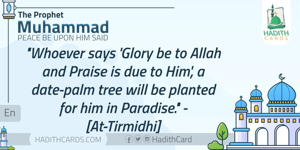 Whoever says 'Glory be to Allah and Praise is due to Him', a date-palm tree will be planted for him in Paradise. - [At-Tirmidhi]