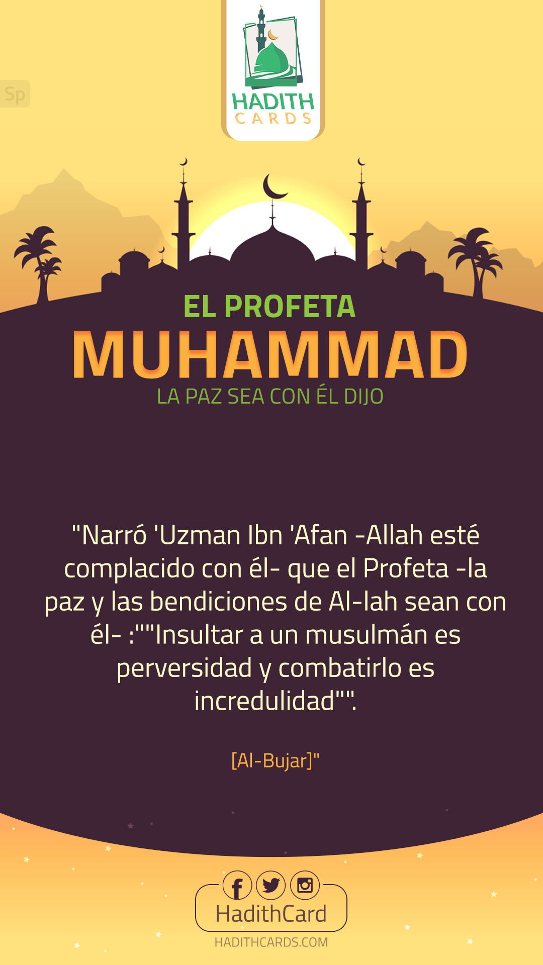 Narró 'Uzman Ibn 'Afan -Allah esté complacido con él- que el Profeta -la paz y las bendiciones de Al-lah sean con él- :"Insultar a un musulmán es perversidad y combatirlo es incredulidad