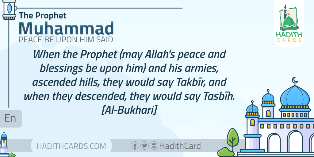 When the Prophet (may Allah's peace and blessings be upon him) and his armies, ascended hills, they would say Takbīr, and when they descended, they would say Tasbīh. [Al-Bukhari]