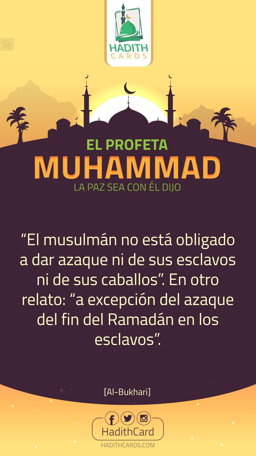 El musulmán no está obligado a dar azaque ni de sus esclavos ni de sus caballos”. En otro relato: “a excepción del azaque del fin del Ramadán en los esclavos