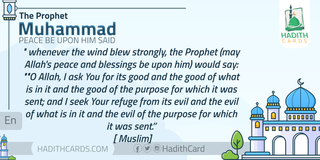 whenever the wind blew strongly, the Prophet (may Allah's peace and blessings be upon him) would say: O Allah, I ask You for its good and the good of what is in it and the good of the purpose for which it was sent; and I seek Your refuge from its evil and the evil of what is in it and the evil of the purpose for which it was sent.