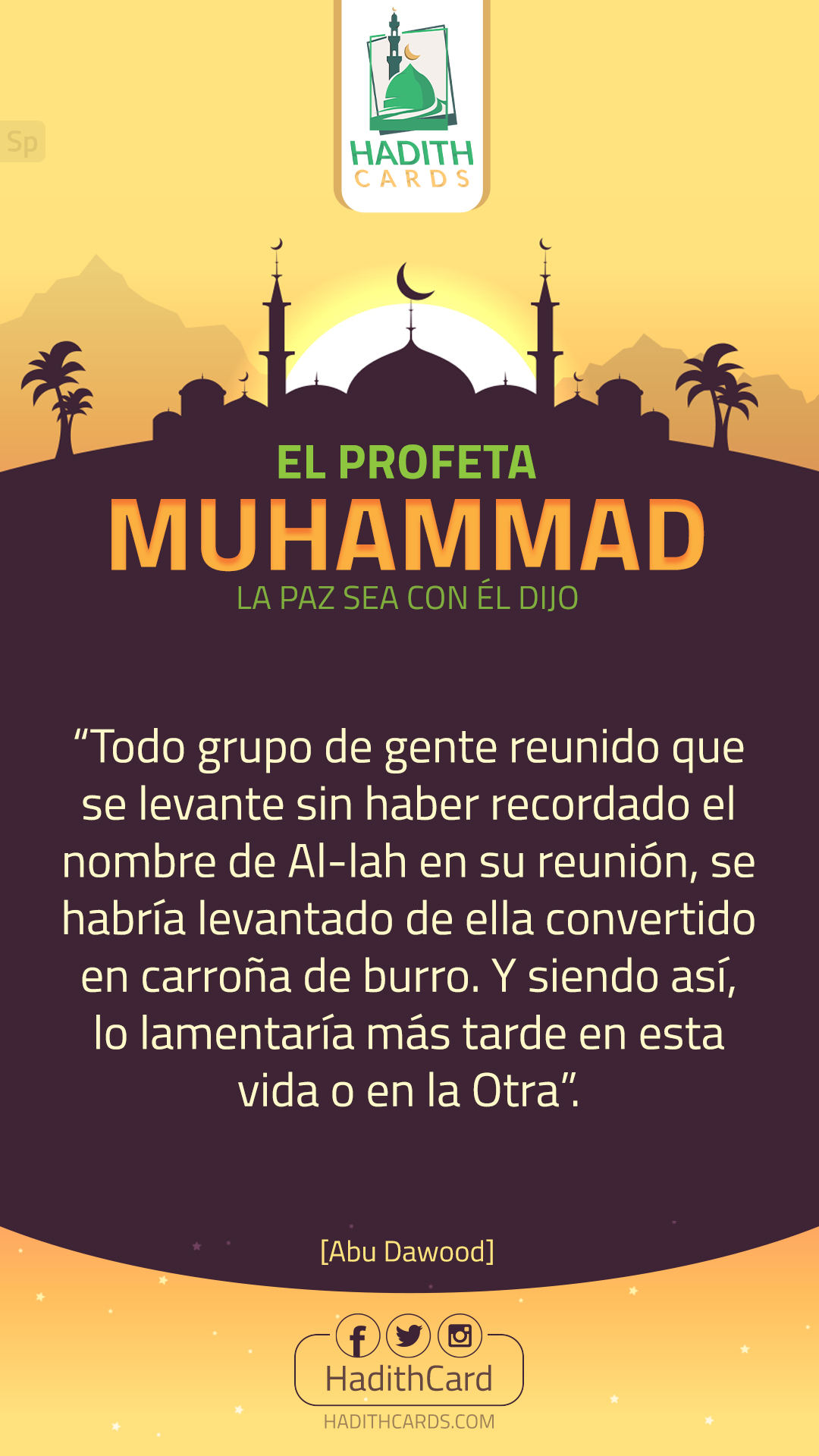 Todo grupo de gente reunido que se levante sin haber recordado el nombre de Al-lah en su reunión, se habría levantado de ella convertido en carroña de burro. Y siendo así, lo lamentaría más tarde en esta vida o en la Otra