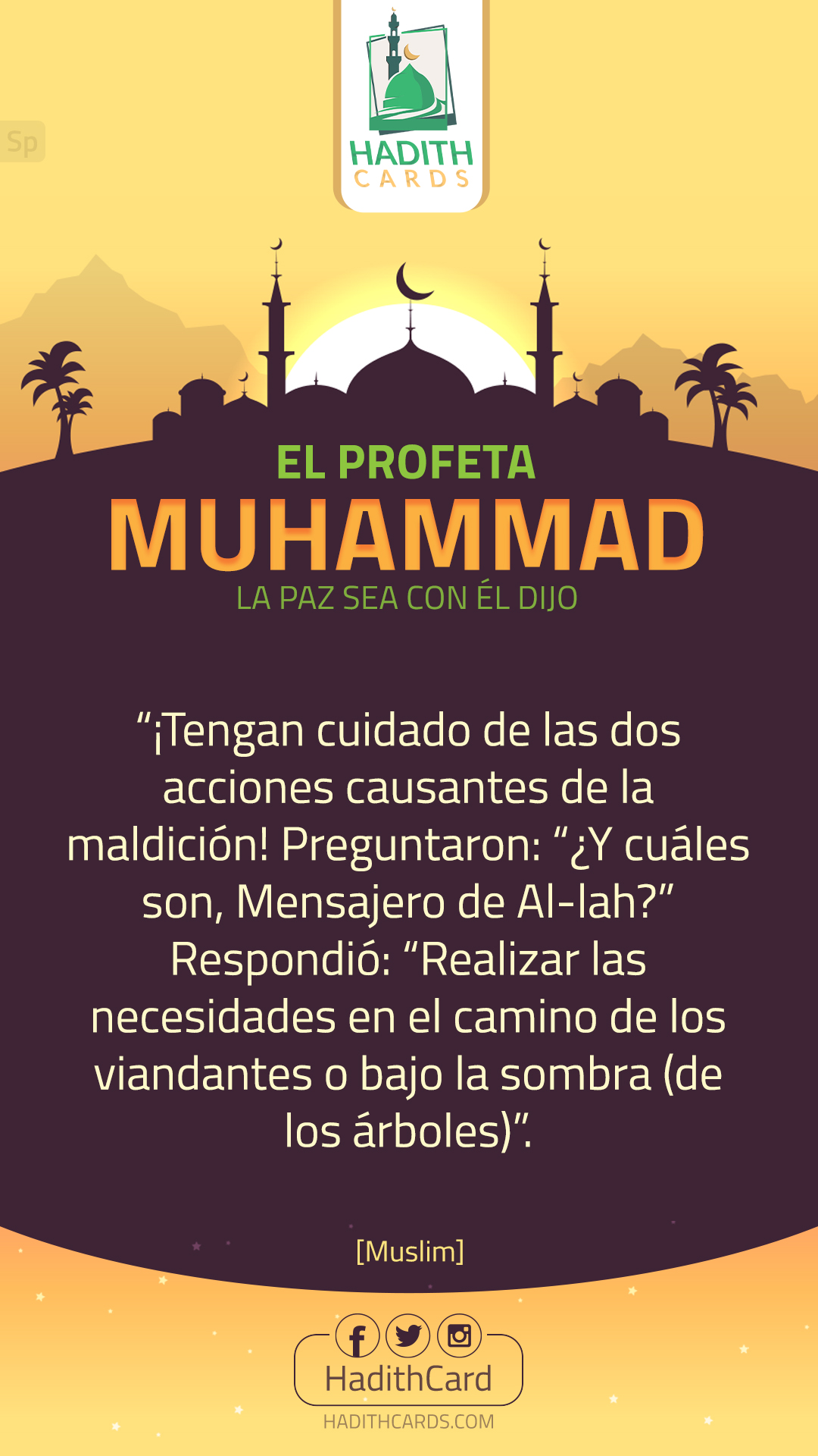 ¡Tengan cuidado de las dos acciones causantes de la maldición! Preguntaron: “¿Y cuáles son, Mensajero de Al-lah?” Respondió: “Realizar las necesidades en el camino de los viandantes o bajo la sombra (de los árboles)