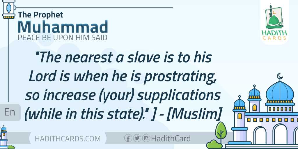 The nearest a slave is to his Lord is when he is prostrating, so increase (your) supplications (while in this state). - [Muslim]