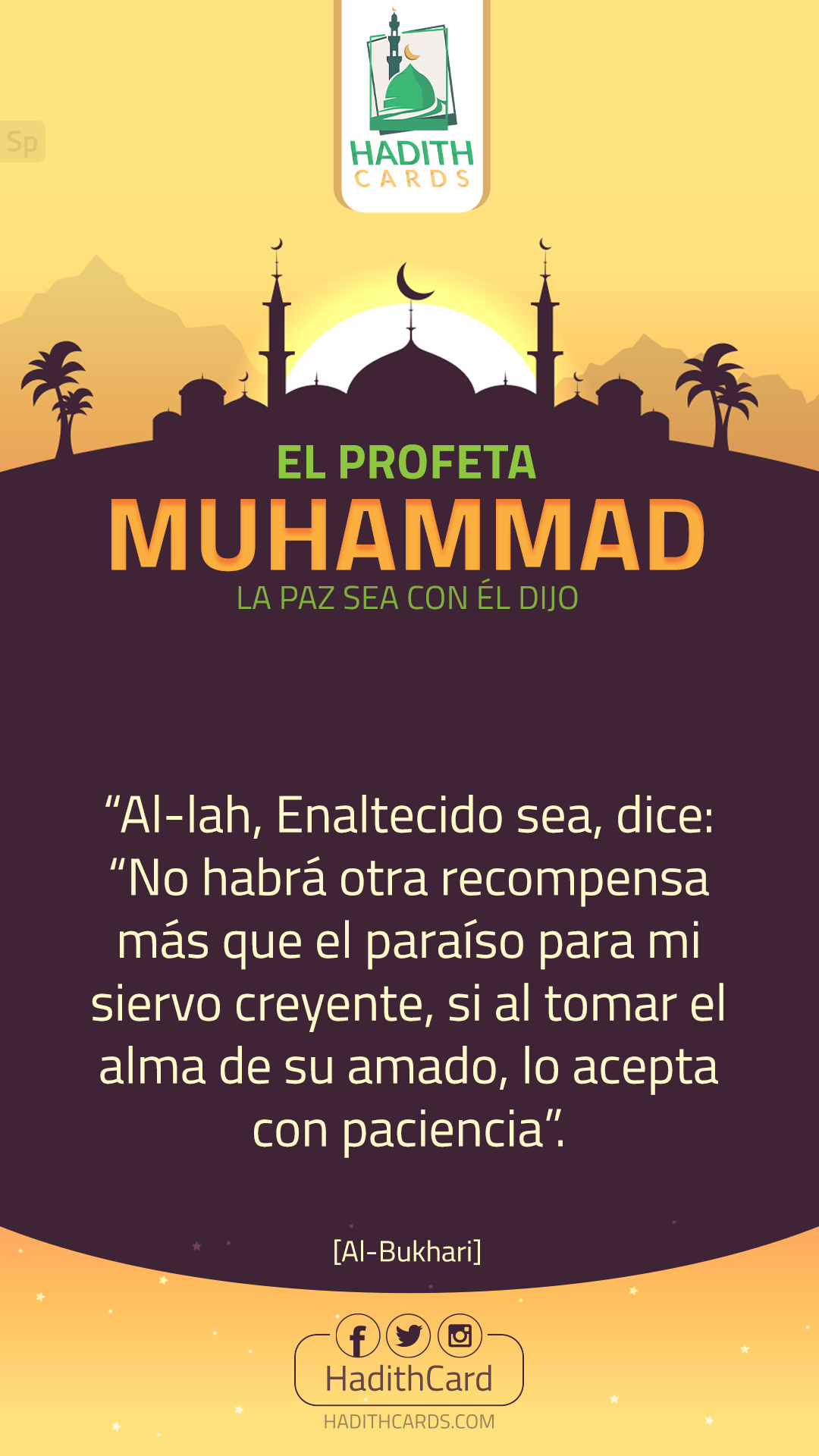 Al-lah, Enaltecido sea, dice: “No habrá otra recompensa más que el paraíso para mi siervo creyente, si al tomar el alma de su amado, lo acepta con paciencia