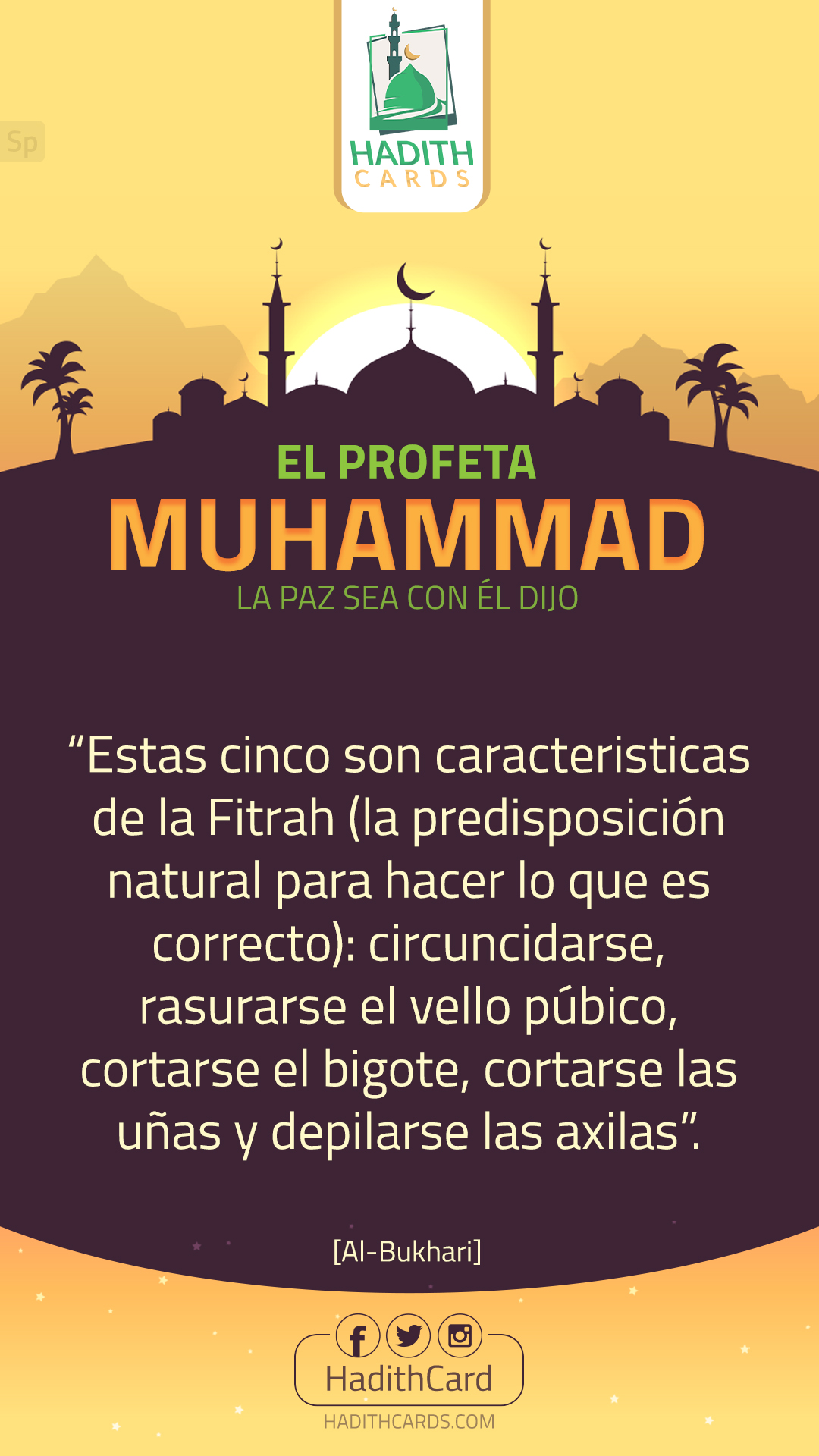 Estas cinco son caracteristicas de la Fitrah (la predisposición natural para hacer lo que es correcto): circuncidarse, rasurarse el vello púbico, cortarse el bigote, cortarse las uñas y depilarse las axilas