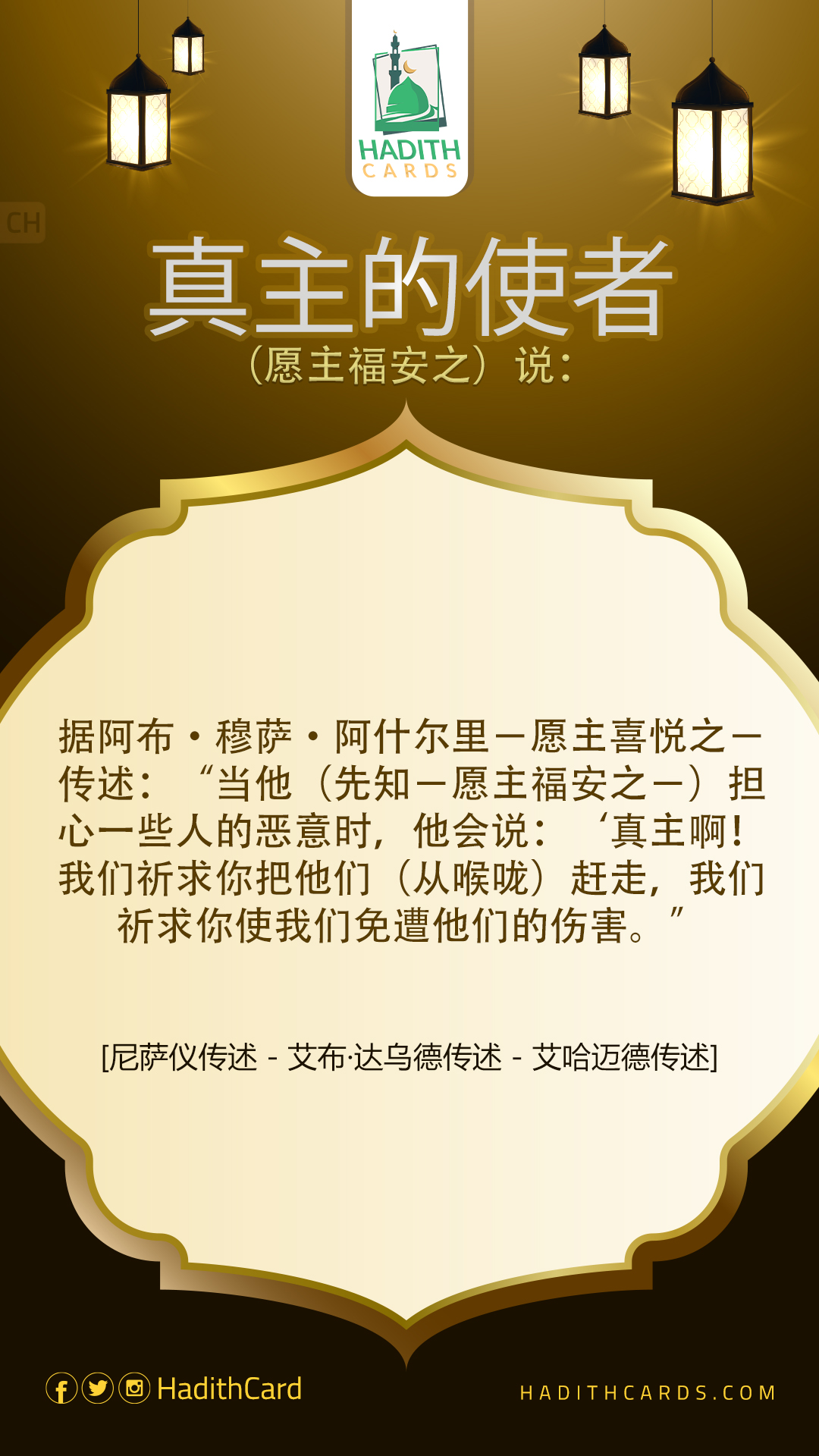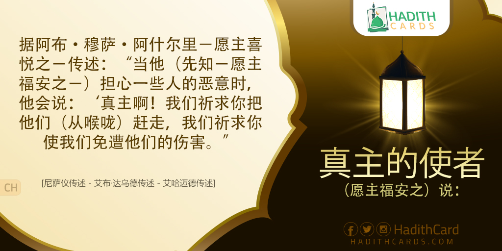 据阿布·穆萨·阿什尔里-愿主喜悦之-传述:“当他(先知-愿主福安之-)担心一些人的恶意时,他会说:‘真主啊!我们祈求你把他们(从喉咙)赶走,我们祈求你使我们免遭他们的伤害。
