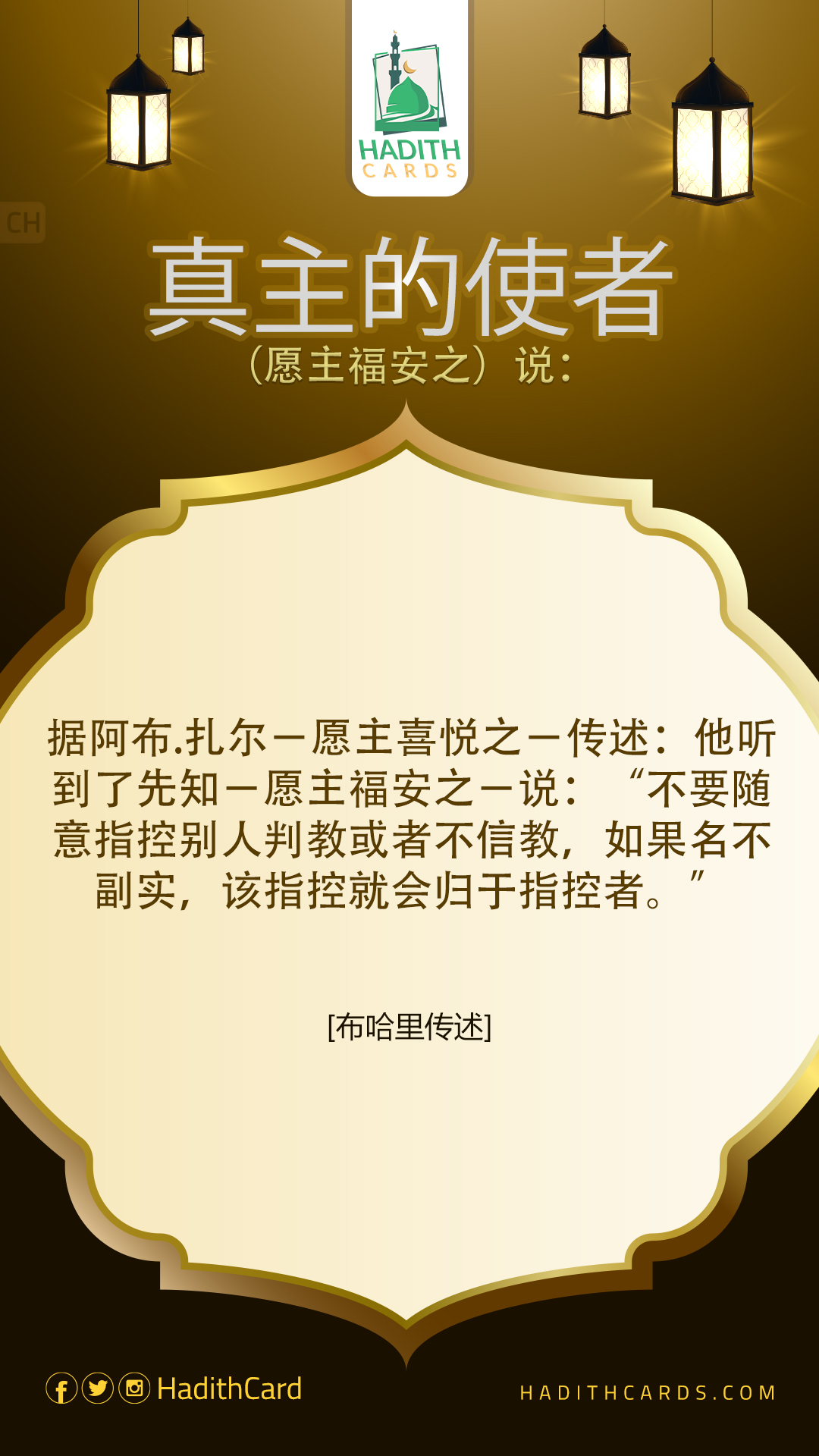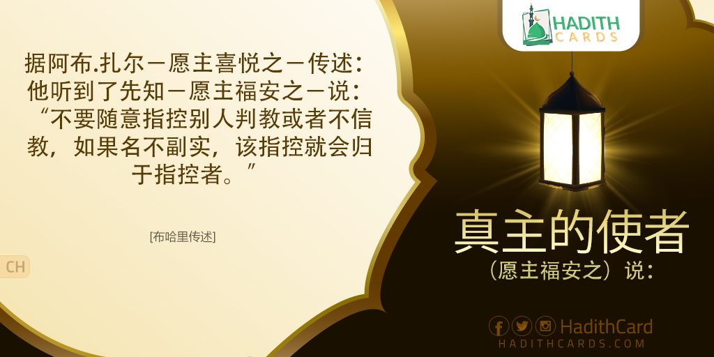 据阿布∙扎尔-愿主喜悦之-传述:他听到了先知-愿主福安之-说:“不要随意指控别人判教或者不信教,如果名不副实,该指控就会归于指控者。