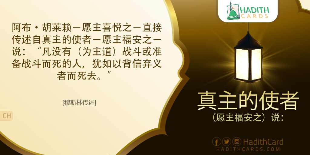 阿布·胡莱赖-愿主喜悦之-直接传述自真主的使者-愿主福安之-说:“凡没有(为主道)战斗或准备战斗而死的人,犹如以背信弃义者而死去。