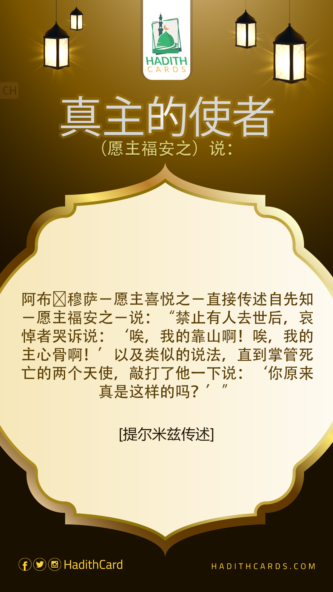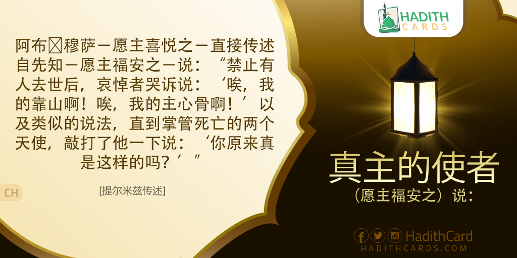 阿布∙穆萨-愿主喜悦之-直接传述自先知-愿主福安之-说:“禁止有人去世后,哀悼者哭诉说:‘唉,我的靠山啊!唉,我的主心骨啊!’以及类似的说法,直到掌管死亡的两个天使,敲打了他一下说:‘你原来真是这样的吗?