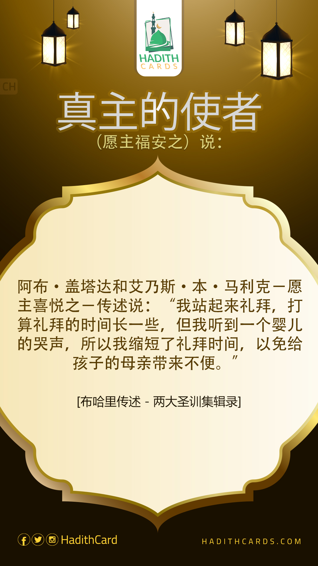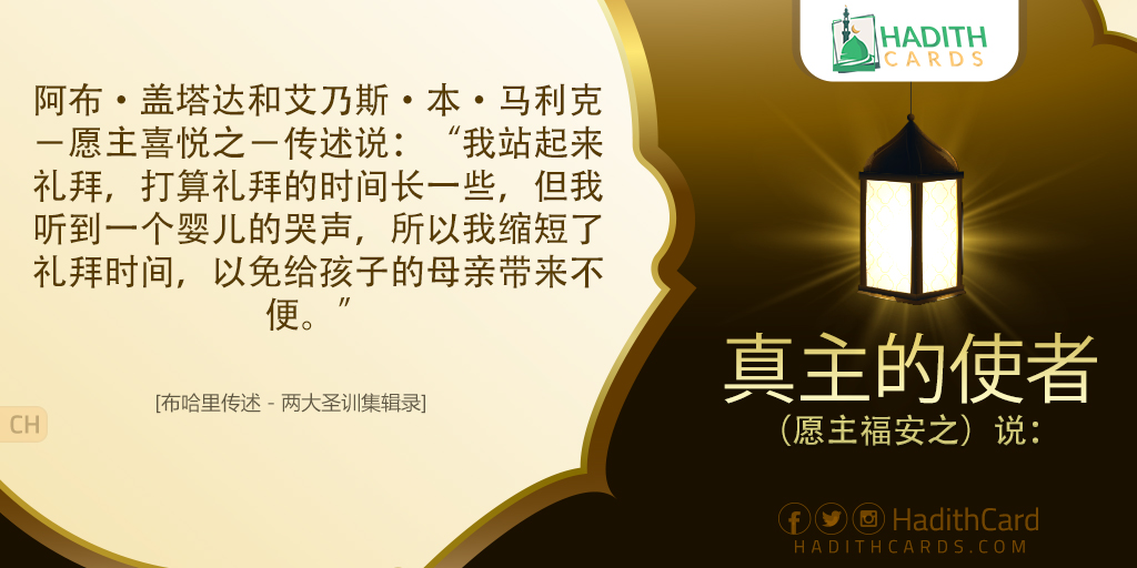 阿布·盖塔达和艾乃斯·本·马利克-愿主喜悦之-传述说:“我站起来礼拜,打算礼拜的时间长一些,但我听到一个婴儿的哭声,所以我缩短了礼拜时间,以免给孩子的母亲带来不便。