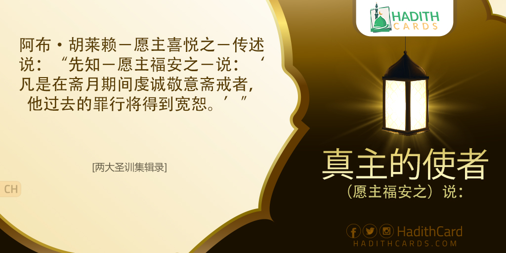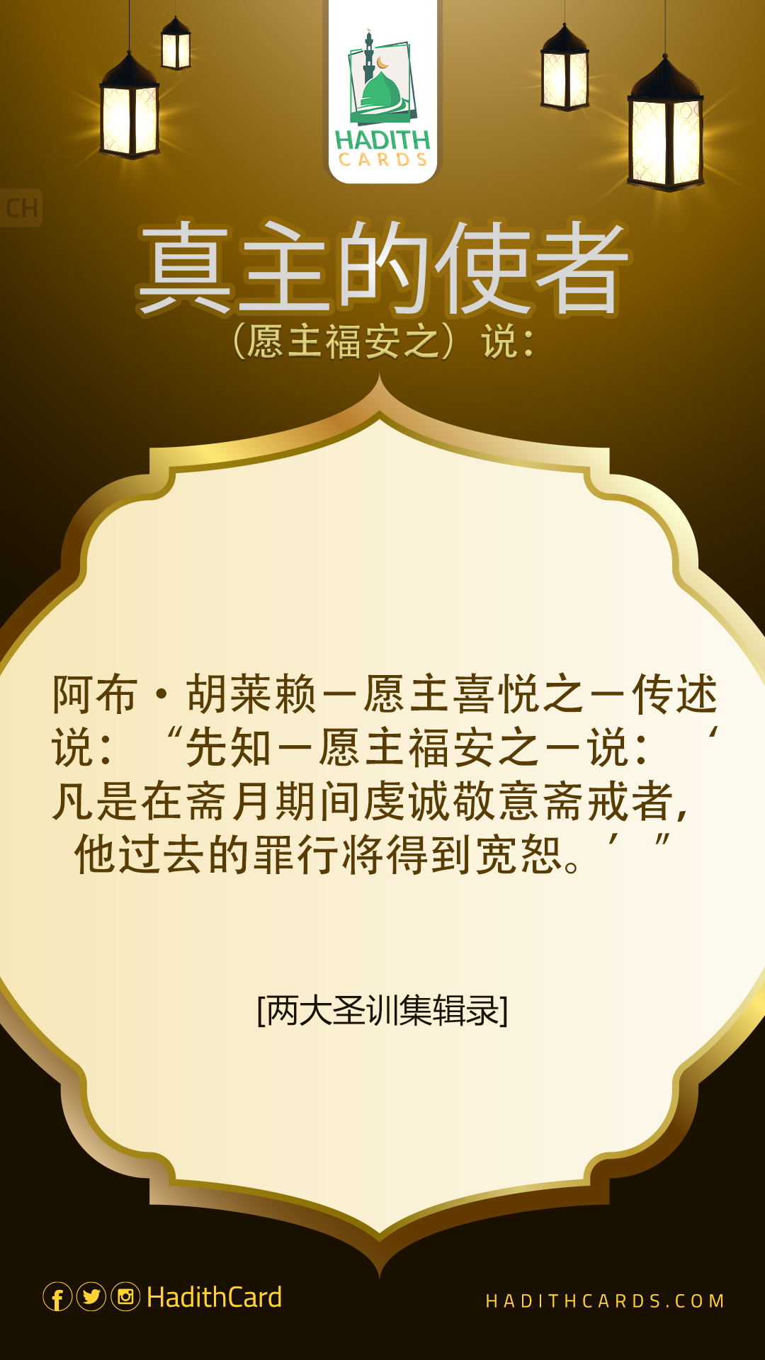 阿布·胡莱赖-愿主喜悦之-传述说:“先知-愿主福安之-说:‘凡是在斋月期间虔诚敬意斋戒者,他过去的罪行将得到宽恕。