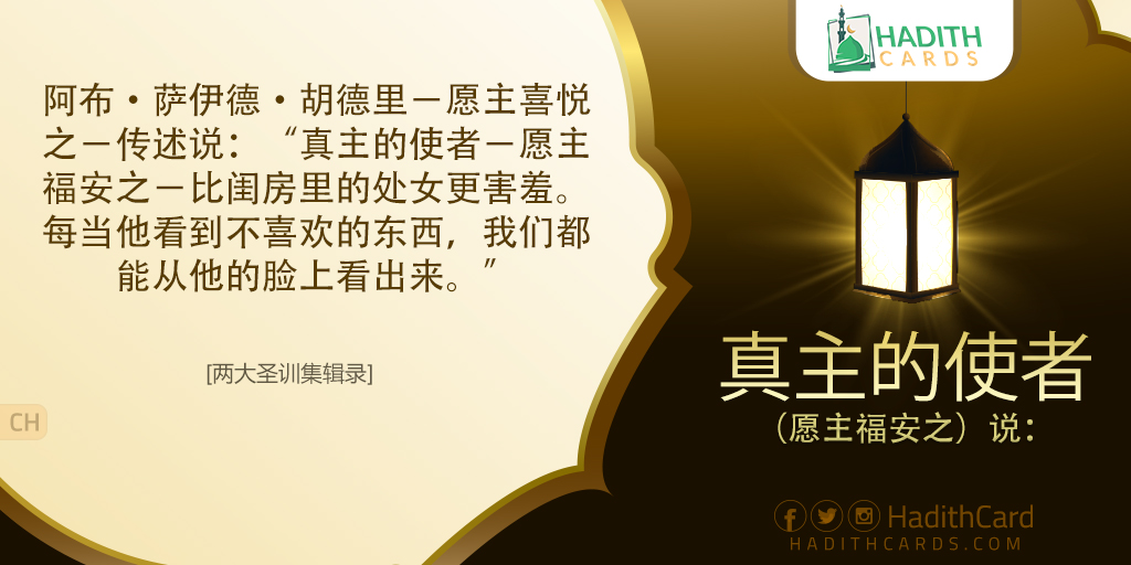 阿布·萨伊德·胡德里-愿主喜悦之-传述说:“真主的使者-愿主福安之-比闺房里的处女更害羞。每当他看到不喜欢的东西,我们都能从他的脸上看出来。