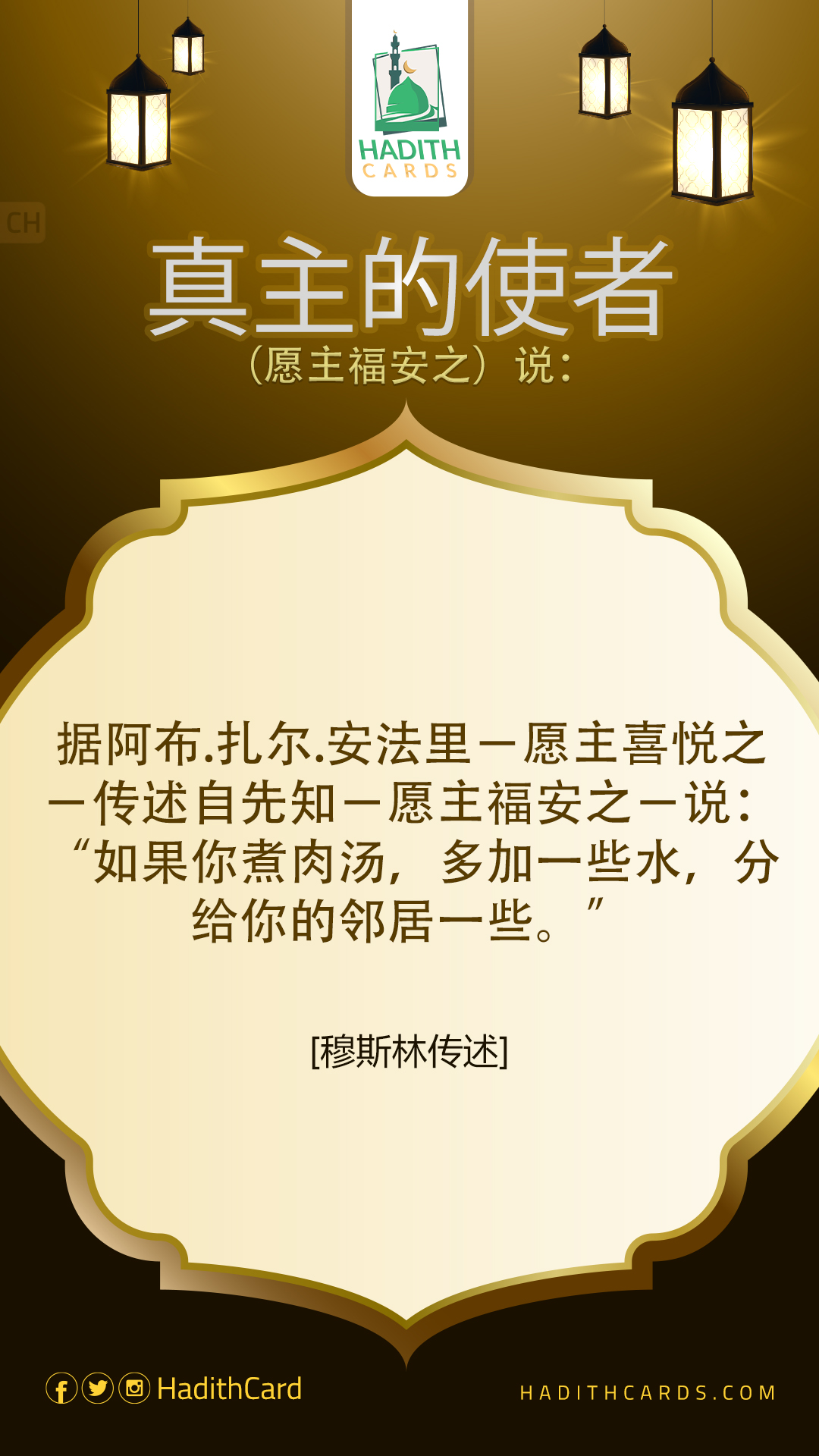 据阿布∙扎尔∙安法里-愿主喜悦之-传述自先知-愿主福安之-说:“如果你煮肉汤,多加一些水,分给你的邻居一些。