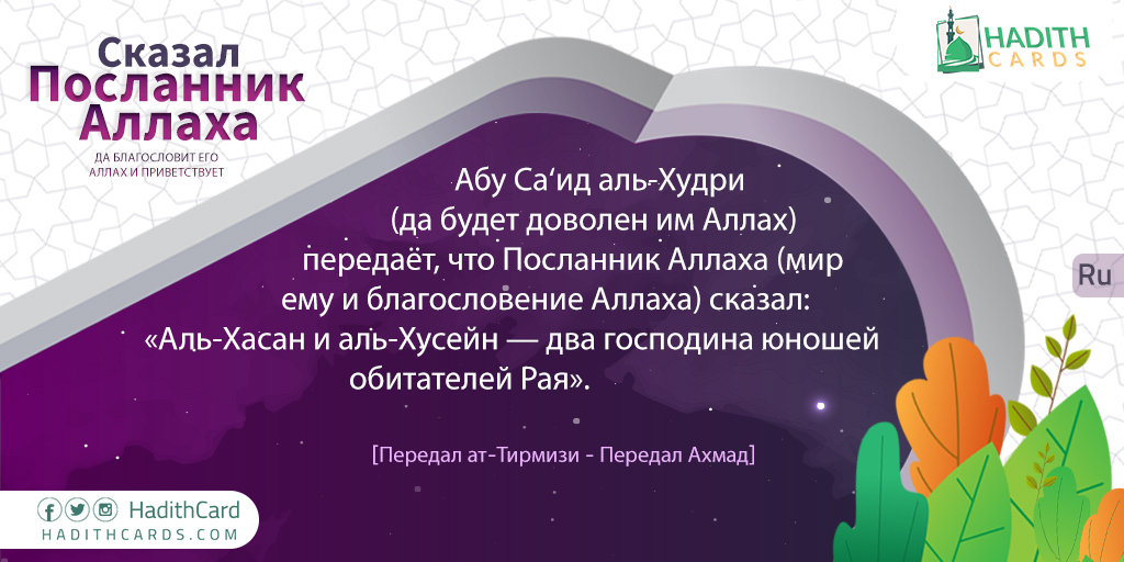 Абу Са‘ид аль-Худри (да будет доволен им Аллах) передаёт, что Посланник Аллаха (мир ему и благословение Аллаха) сказал: «Аль-Хасан и аль-Хусейн — два господина юношей обитателей Рая»