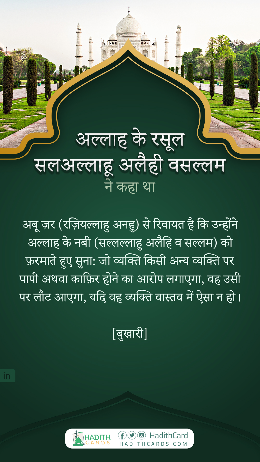अबू ज़र (रज़ियल्लाहु अनहु) से रिवायत है कि उन्होंने अल्लाह के नबी (सल्लल्लाहु अलैहि व सल्लम) को फ़रमाते हुए सुना: जो व्यक्ति किसी अन्य व्यक्ति पर पापी अथवा काफ़िर होने का आरोप लगाएगा, वह उसी पर लौट आएगा, यदि वह व्यक्ति वास्तव में ऐसा न हो।