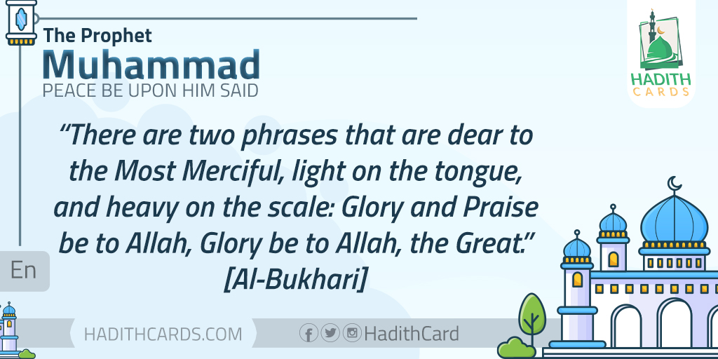 There are two phrases that are dear to the Most Merciful, light on the tongue, and heavy on the scale: Glory and Praise be to Allah, Glory be to Allah, the Great. [Al-Bukhari]