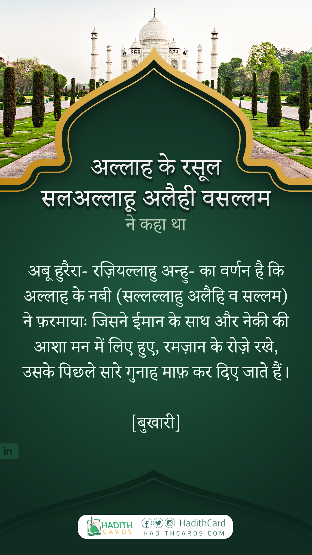 अबू हुरैरा- रज़ियल्लाहु अन्हु- का वर्णन है कि अल्लाह के नबी (सल्लल्लाहु अलैहि व सल्लम) ने फ़रमायाः जिसने ईमान के साथ और नेकी की आशा मन में लिए हुए, रमज़ान के रोज़े रखे, उसके पिछले सारे गुनाह माफ़ कर दिए जाते हैं।