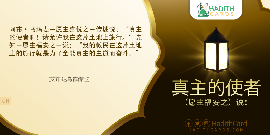 阿布·乌玛麦-愿主喜悦之-传述说:“真主的使者啊!请允许我在这片土地上旅行。”先知-愿主福安之-说:“我的教民在这片土地上的旅行就是为了全能真主的主道而奋斗。