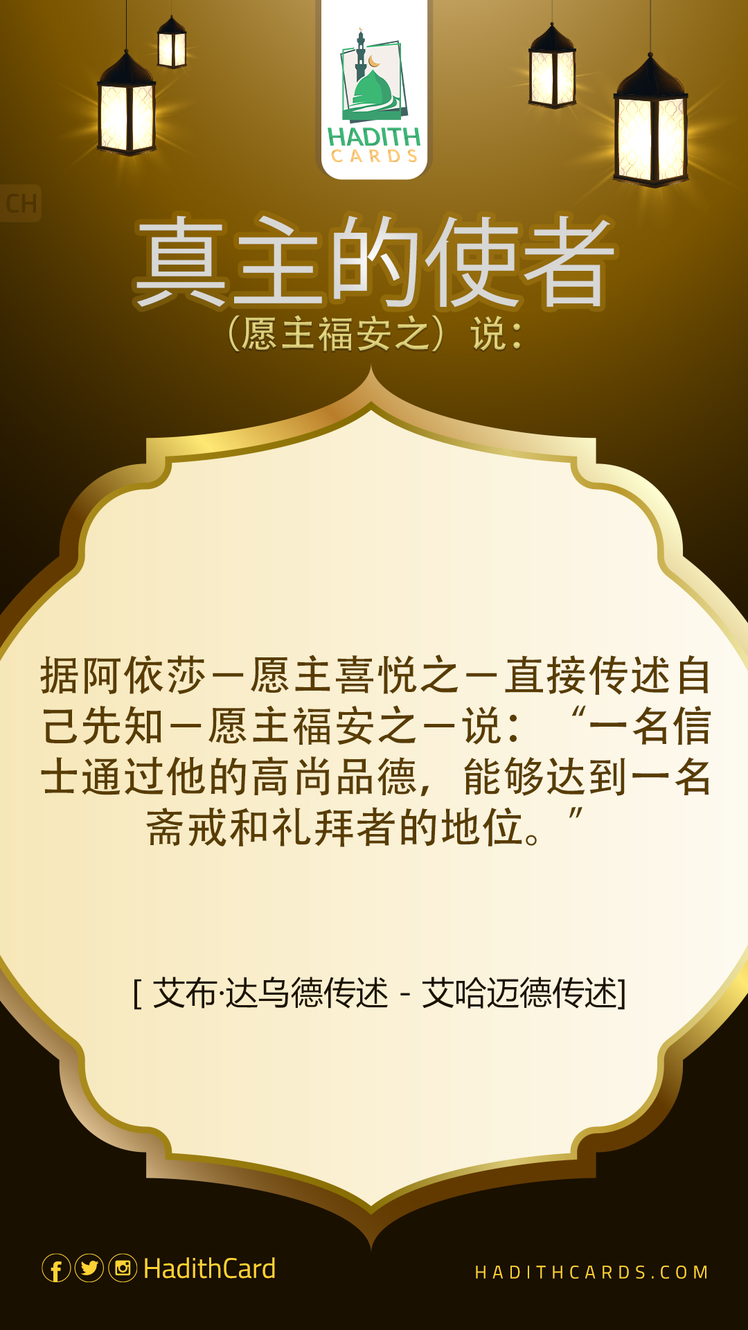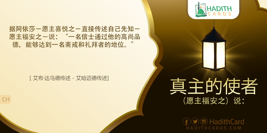 据阿依莎-愿主喜悦之-直接传述自己先知-愿主福安之-说:“一名信士通过他的高尚品德,能够达到一名斋戒和礼拜者的地位。