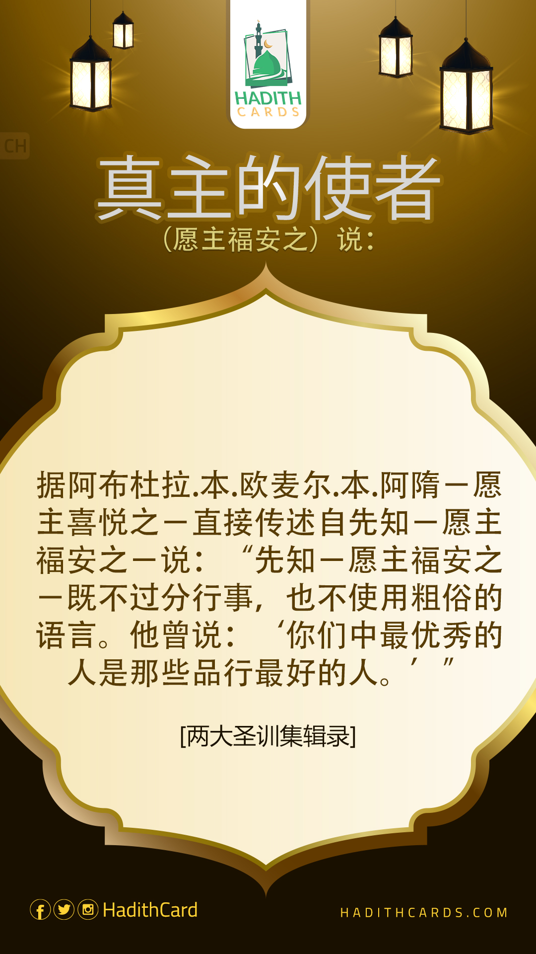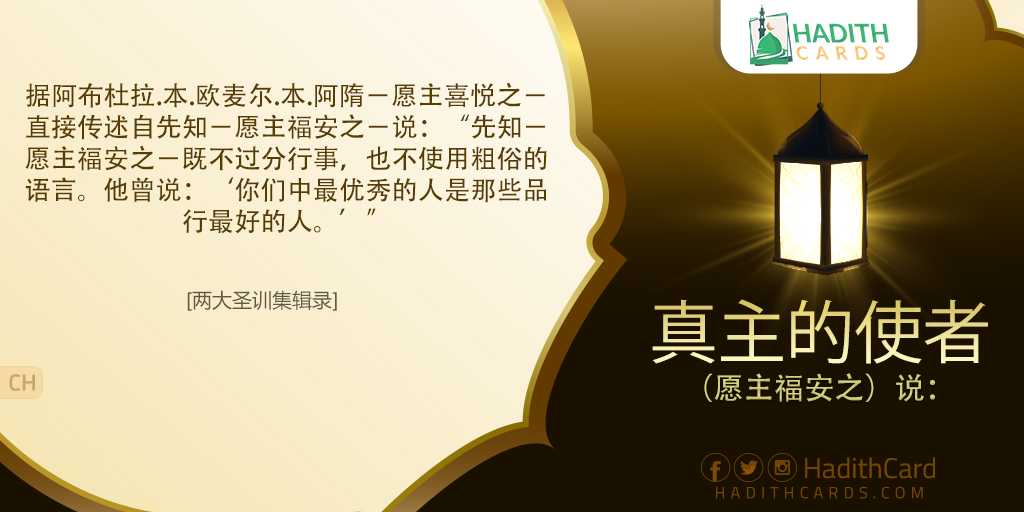 据阿布杜拉∙本∙欧麦尔∙本∙阿隋-愿主喜悦之-直接传述自先知-愿主福安之-说:“先知-愿主福安之-既不过分行事,也不使用粗俗的语言。他曾说:‘你们中最优秀的人是那些品行最好的人。