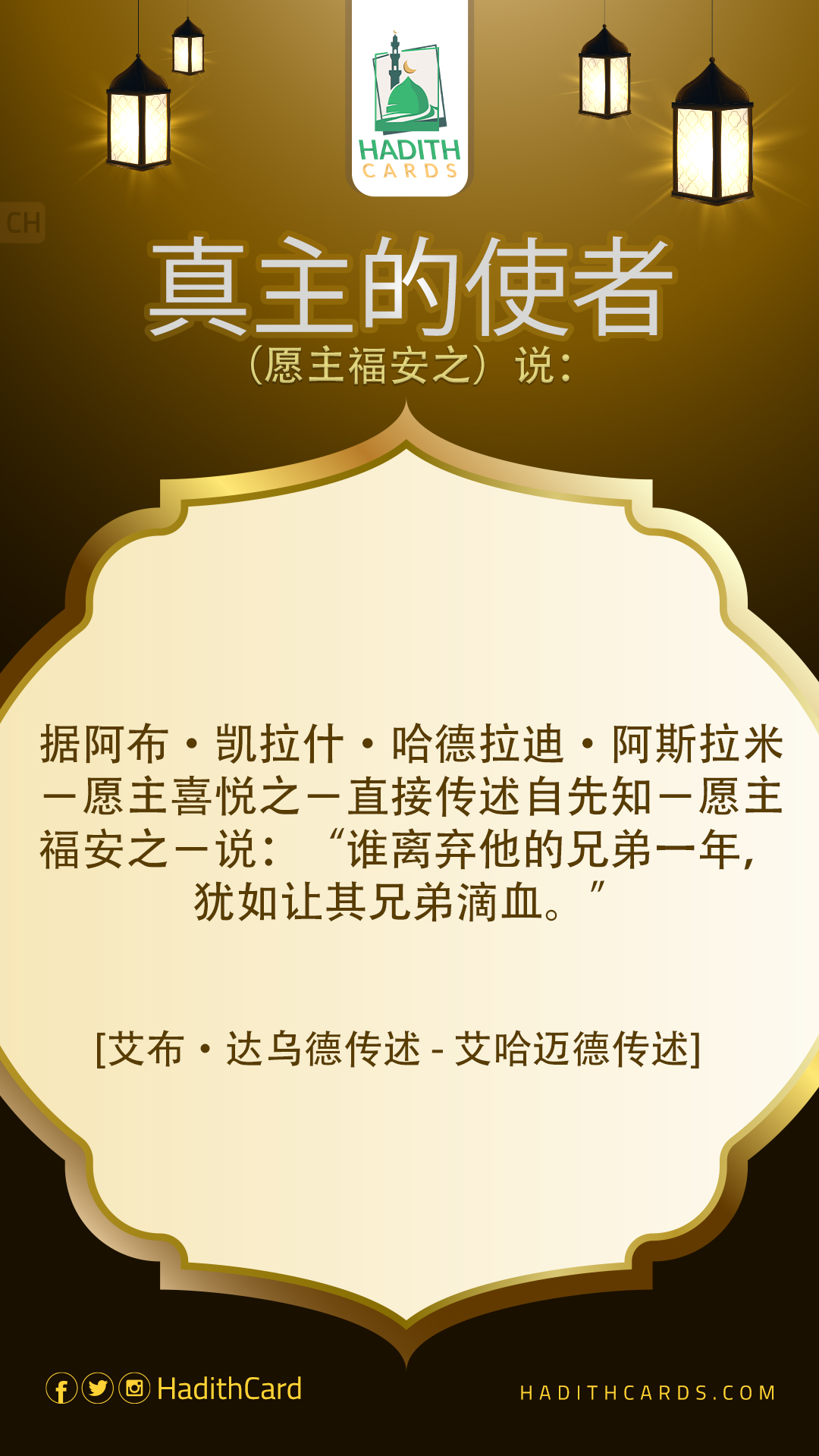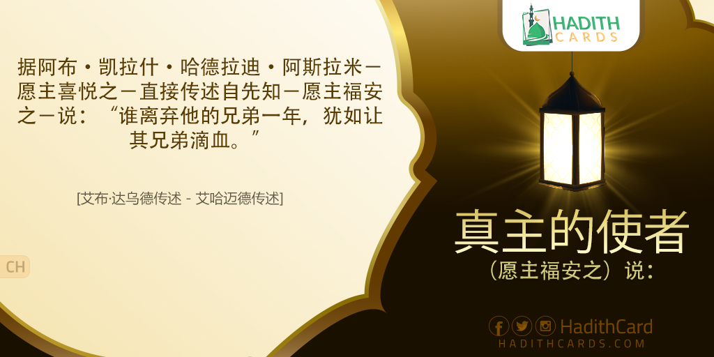 据阿布·凯拉什·哈德拉迪·阿斯拉米-愿主喜悦之-直接传述自先知-愿主福安之-说:“谁离弃他的兄弟一年,犹如让其兄弟滴血。